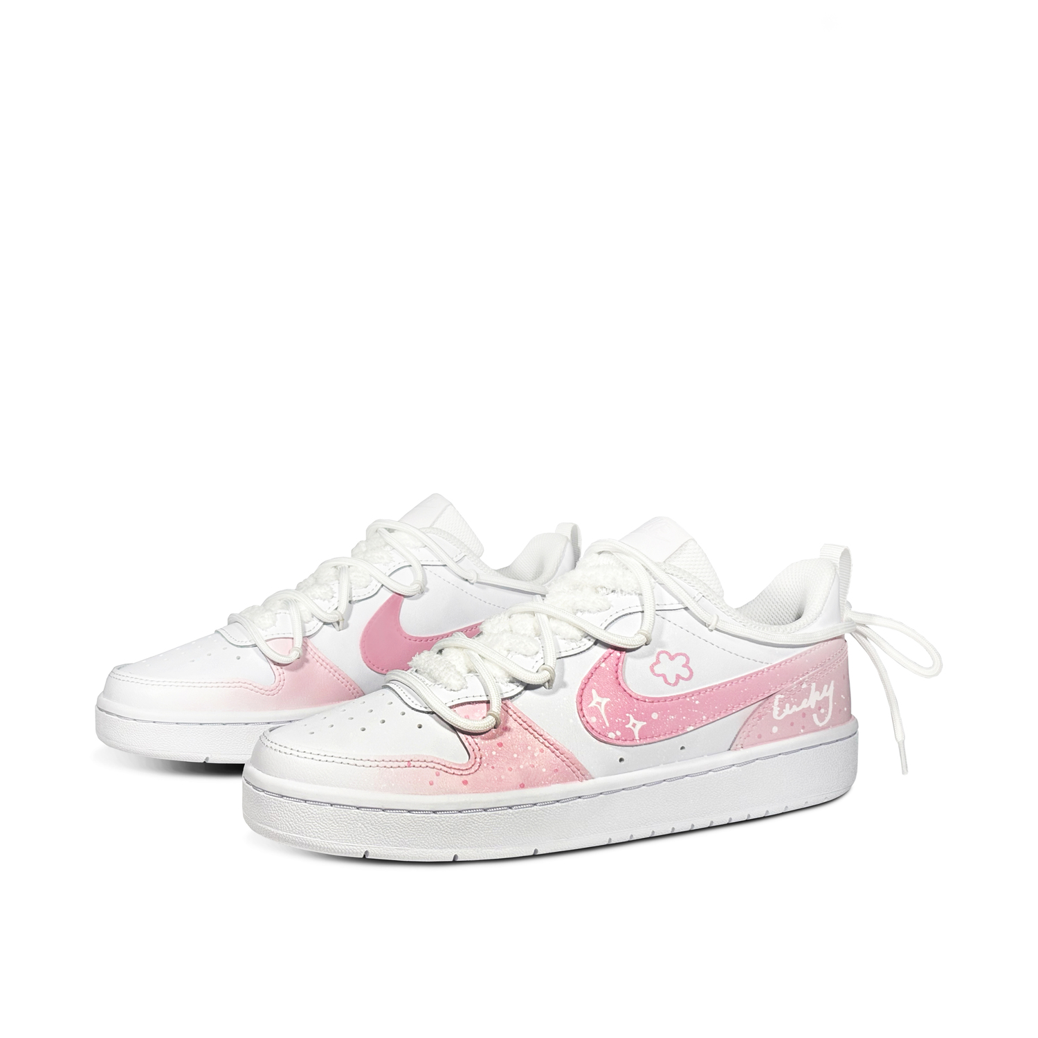 Эти кроссовки, изготовленные на заказ, созданы на основе белых низких женских кроссовок Nike (артикул BQ5448-100), обеспечивающих комфорт, противоскользящее действие, прочность и легкость. Вдохновение пришло от удачи. Верх выполнен в освежающей розово-белой цветовой гамме с нарисованными вручную граффити в виде звезд и облаков, дополненными английскими буквами. Деконструированная двойная шнуровка добавляет нотку изысканности. Эти кроссовки можно стирать обычным способом. Во время носки избегайте интенсивной активности и контакта с острыми предметами, чтобы предотвратить появление царапин на нарисованных вручную буквах. Не используйте для чистки концентрированные органические растворители. При чистке рекомендуется использовать мягкую щетку с подходящей концентрацией моющего средства, чтобы аккуратно потереть обувь.