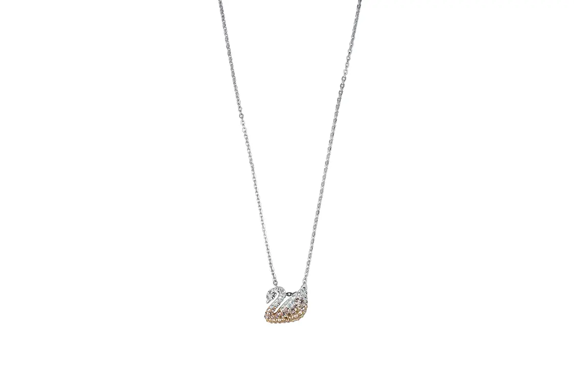 Это элегантное и пленительное колье с покрытием из белого золота представляет собой современную интерпретацию культового лебедя бренда. Подвеска, изготовленная с использованием эксклюзивной техники Swarovski Pointiage, искусно инкрустирована тонкими кристаллами градиентных оттенков, которые придают любому наряду искрящийся и восхитительный блеск. Колье изготовлено преимущественно из кристаллов и сплавов. Внешний слой сплава покрыт драгоценными металлами, а внутренний - специальным прочным сплавом. Драгоценное покрытие в основном состоит из восьми элементов: золота, серебра и металлов платиновой группы (рутения, родия, палладия, осмия, иридия и платины).