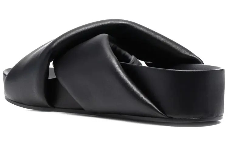 Детали дизайна: черный цвет, перекрещивающиеся ремешки на носке, открытый носок, стелька с логотипом, плоская подошва. Верх: овчина. Подошва: резина, кожа. Подкладка: кожа.