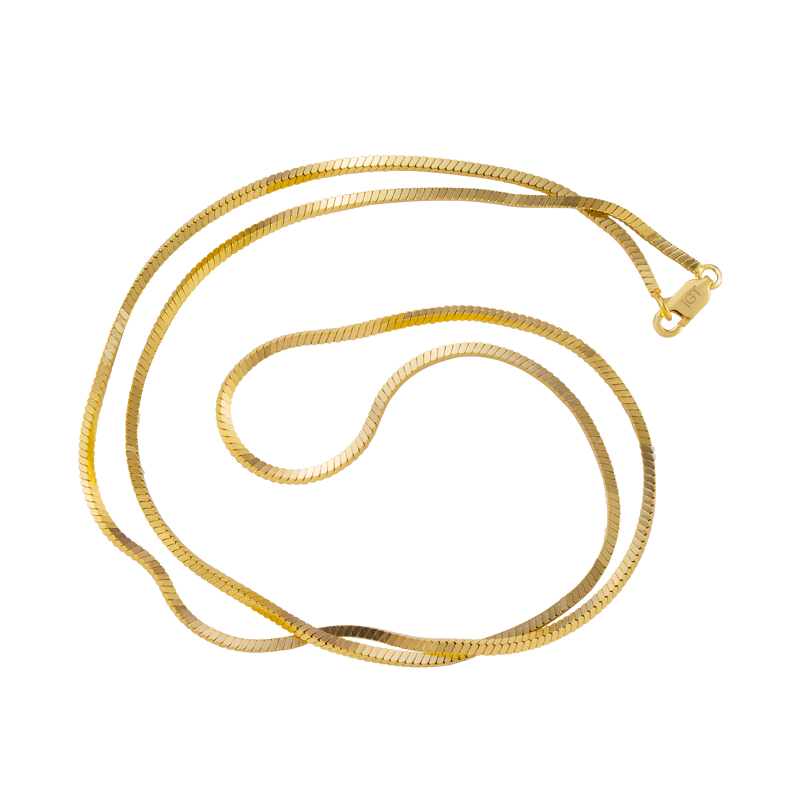 Характеристики: Золотая плоская квадратная цепочка из змеиной кости, сложенная на 20 дюймов + 22 дюйма.