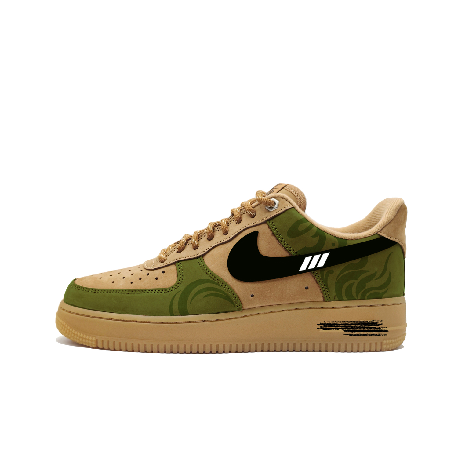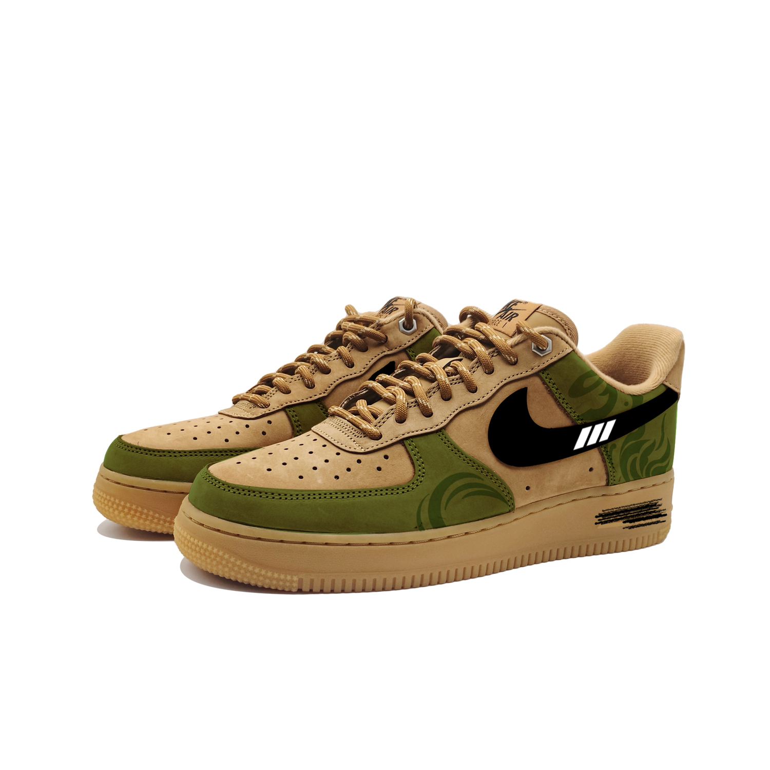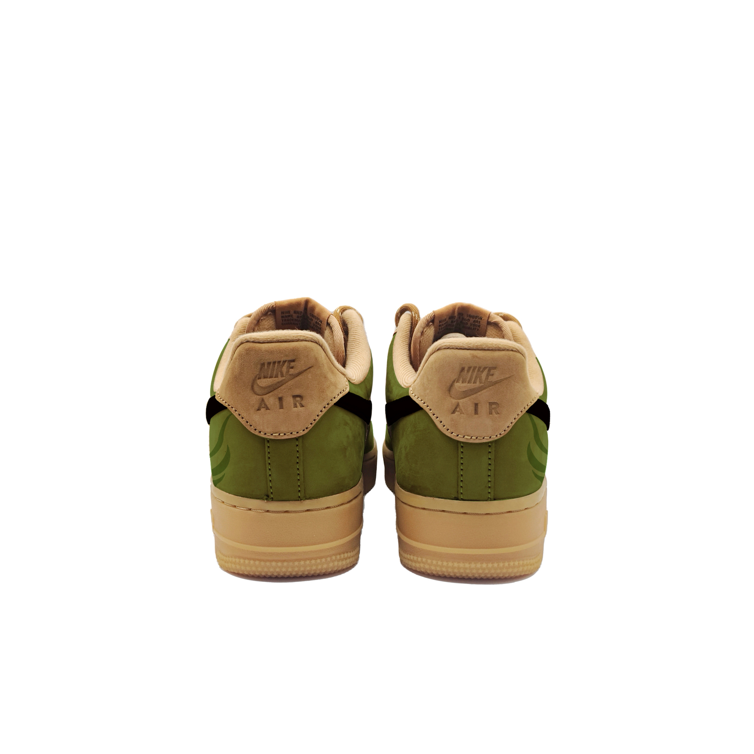 Эти кроссовки созданы на основе оригинальных кроссовок Nike Air Force 1 07LV8 "Wheat/Flax" в классическом ретро-стиле из кожи, устойчивой к скольжению, износостойкой и легкой, в пшеничном цвете унисекс. Артикул оригинальной модели - CJ9179-200, а дополнительный артикул - FZ7372-200. Дизайн вдохновлен темой «тайны зеленого поля»: «зеленое поле» олицетворяет зеленые элементы на кроссовках, создавая ощущение единения с природой; «тайна» добавляет ощущение таинственности и исследования, создавая ощущение, что эти кроссовки - это отправная точка для уникального путешествия.