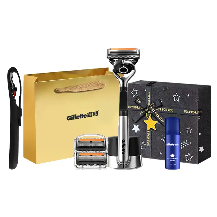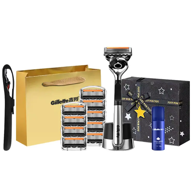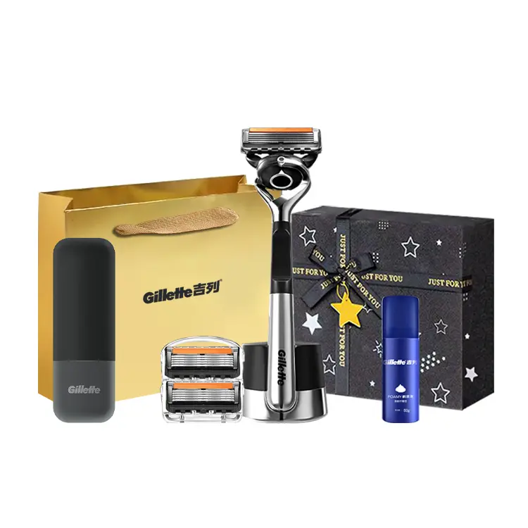 Версия: Gillette Gravity Box с 2 бритвенными головками + пена для бритья + футляр для лезвий + эксклюзивная сумка для покупок Gillette + коробка с детским бальзамом
