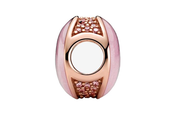 Металл: Pandora Rose (уникальный сплав меди и серебра). Драгоценные камни: 38 круглых переливающихся розовых кубических циркониевых бусин бриллиантовой огранки. Эмаль: Перламутр. Узор/форма: Вогнутая нить из бусин, изогнутая спереди и сзади, украшенная розовой эмалью, с паве по бокам. Особенности: Непрозрачная розовая эмаль с завитками, нанесенная с обеих сторон, создает эффект розового кварца; каждое изделие расписано вручную, уникально. Вдохновение: Использование расписанной вручную эмали для создания несовершенной поверхности, подобной натуральным драгоценным камням, имитирующей естественные изъяны и природную красоту.