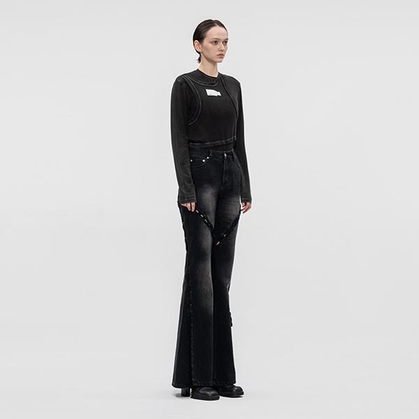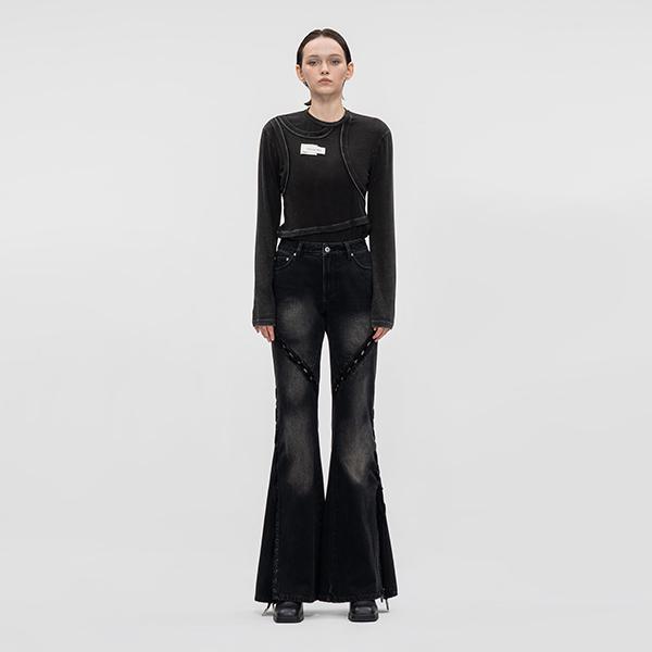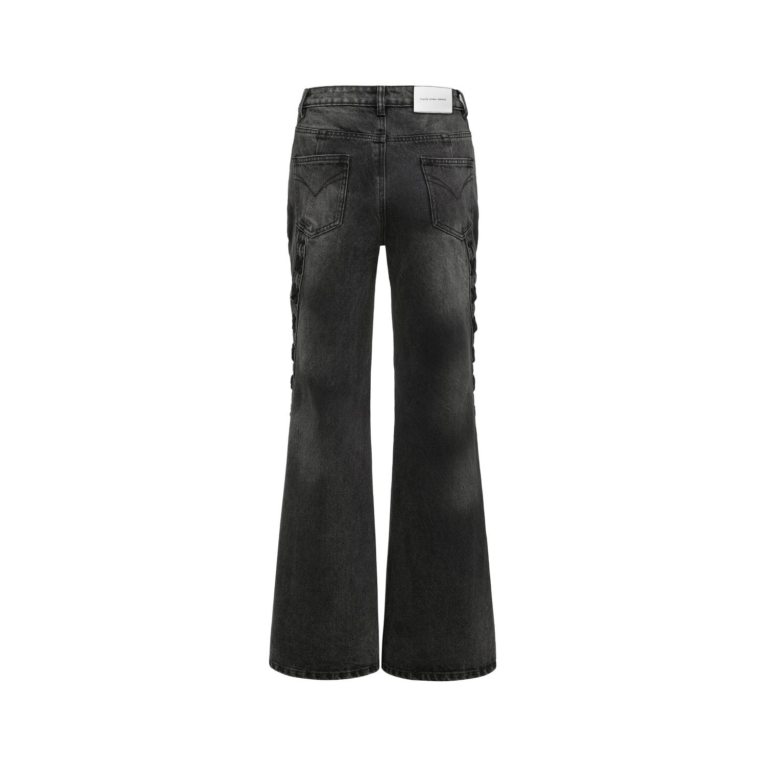 Эти джинсы классического расклешенного кроя с замысловатыми ажурными деталями из перекрещивающихся шнурков придают им изысканный дизайн и визуально подчеркивают силуэт. Классический черный цвет с эффектом потертости - вневременная и универсальная вещь, гармонично сочетающая стиль и функциональность, создавая уникальный образ.