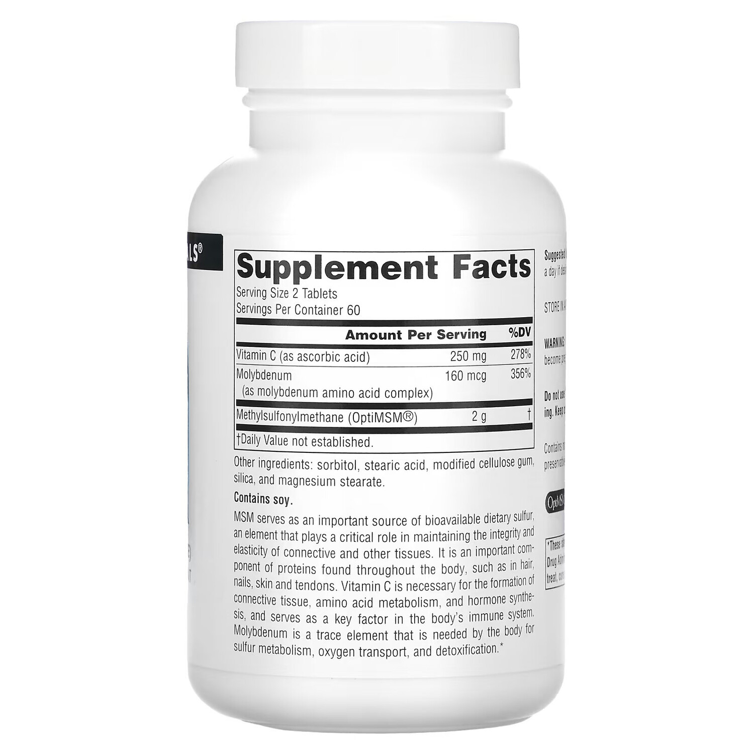 МСМ является важным источником биодоступной пищевой серы, элемента, который играет ключевую роль в поддержании целостности и эластичности соединительной и других тканей. Это важный компонент белков, которые содержатся во всем организме, например, в волосах, ногтях, коже и сухожилиях. Витамин С необходим для образования соединительной ткани, метаболизма аминокислот и синтеза гормонов, а также является ключевым фактором в работе иммунной системы организма. Молибден — микроэлемент, необходимый организму для метаболизма серы, переноса кислорода и детоксикации.