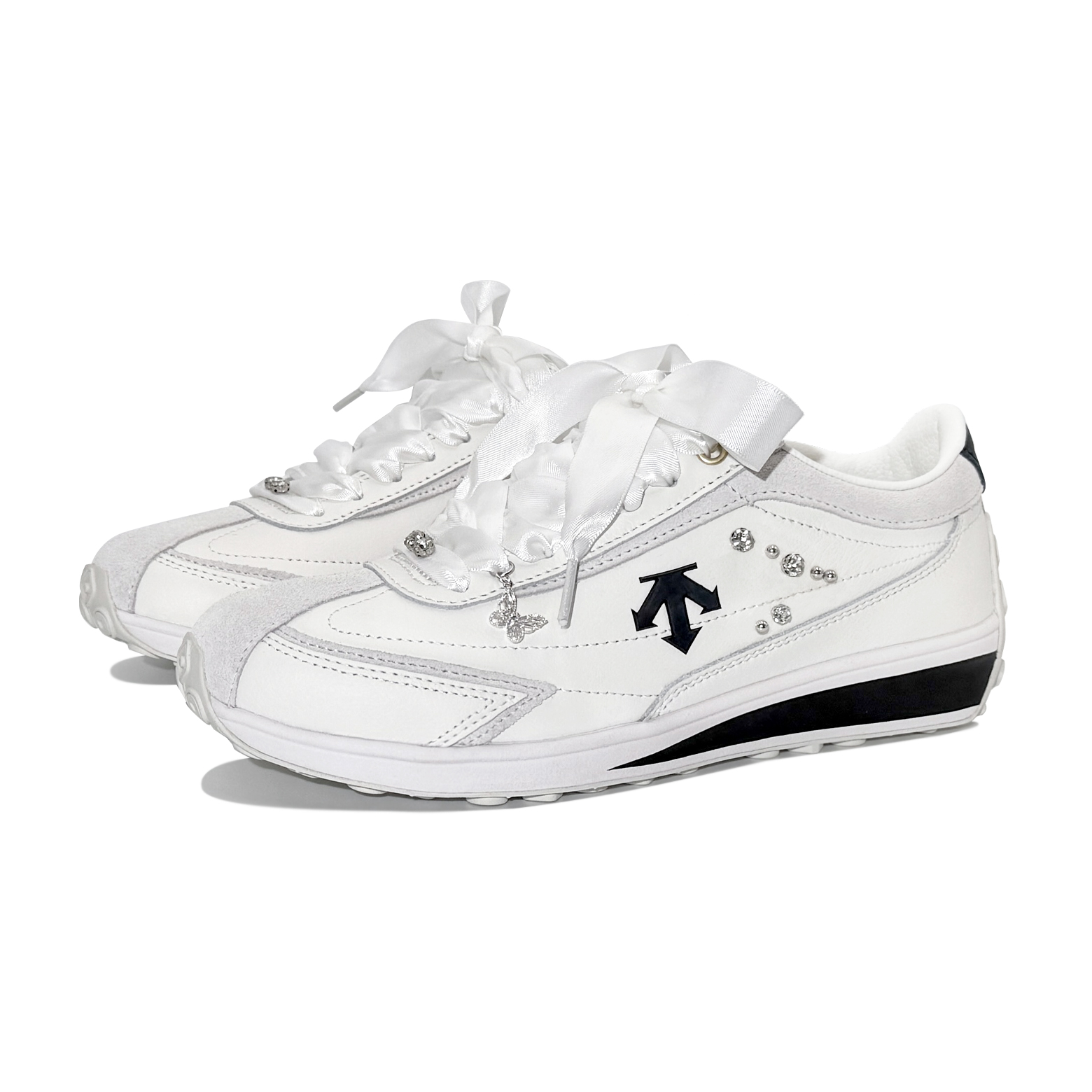Эти кроссовки, созданные на заказ, основаны на оригинальной модели DESCENTE Cron Racer (артикул SQ123LCR11-BKWH) с дополнительным артикулом SQ313LCR71-BKWH. Кроссовки украшены стразами индивидуальной огранки, украшенными бусинами, которые преломляют свет, подобно звездам, при разном освещении, напоминая струящуюся галактику в ночи. Сверкающие подвески в виде бабочек, свисающие со шнурков, легко колышутся при каждом шаге, словно порхающие в воздухе бабочки, придавая каждому движению динамичный поэтический штрих. Каждая деталь выполнена в соответствии со стандартами высокой моды: сочетание прочного металла и сверкающих бриллиантов интерпретирует современную эстетику, сдержанную, но полную напряжения.