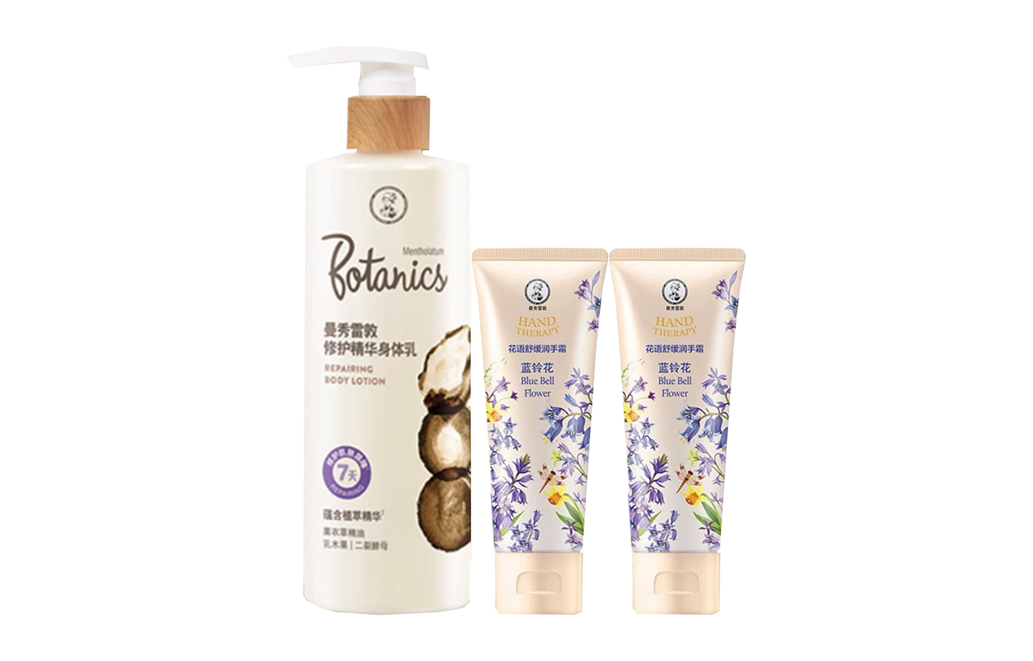 Нетто-содержимое косметического средства: восстанавливающий лосьон для тела 250 мл + цветочный крем для рук с жасмином 50 г x 2