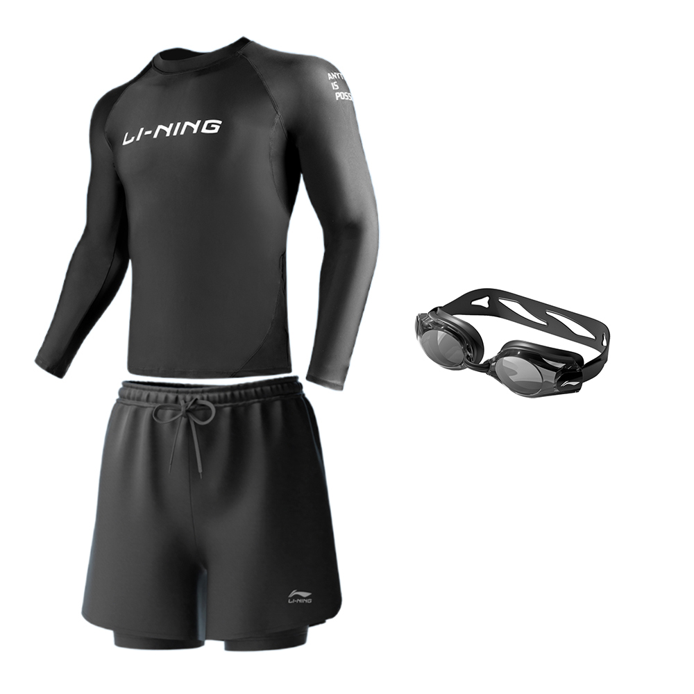 Комплект: комплект из четырех предметов (купальник с длинными рукавами + шорты длиной пять четвертей + черные очки для плавания + черная шапочка для плавания)