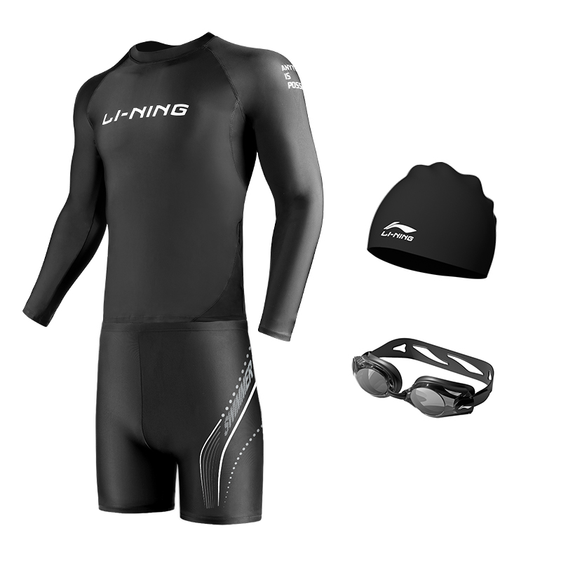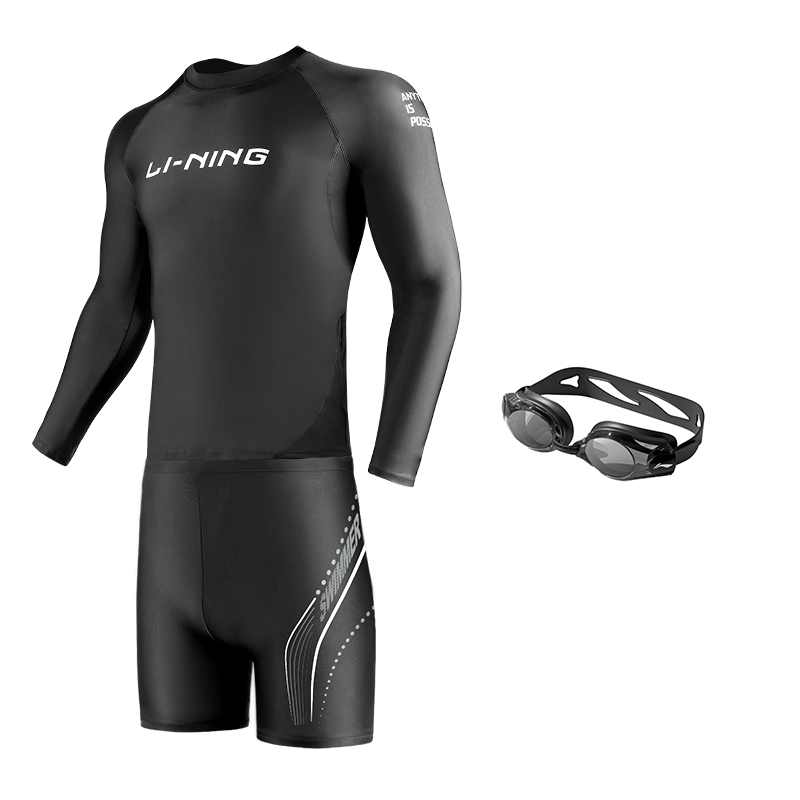 Комплект: Комплекты одежды (черный купальник + черные плавки до колен + очки для плавания)