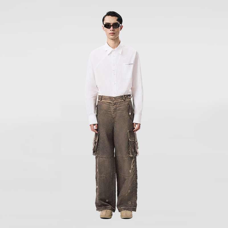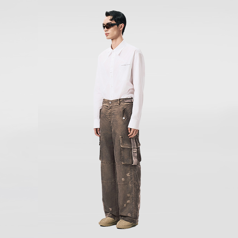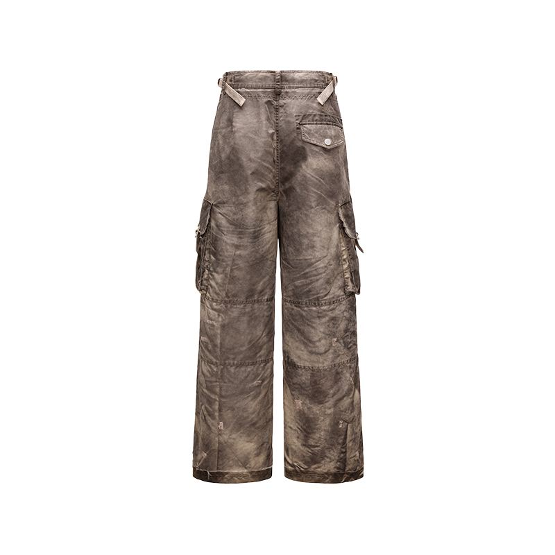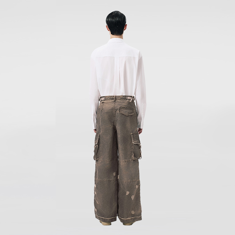 Эти рабочие брюки из нейлона с пескоочисткой тщательно изготовлены вручную методом пескоочистки. Брюки имеют бахрому по краям и карманы с пряжками. Состаренные детали и уникальная красновато-коричневая отделка методом распыления в сочетании с карманами и петлями с пряжками делают эти рабочие брюки одновременно практичными и стильными.