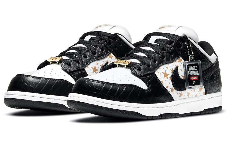 Кроссовки Nike SB Dunk Low будут представлены в цветах Super Blue, Average Green, Black и Barkroot Brown вместо оригинальных оранжевого, красного и Caroline Blue. Каждая пара будет украшена золотыми звездами на боковых панелях и выполнена из кожи аллигатора. Логотип Supreme можно найти на шнурках и стельках.