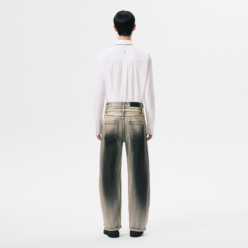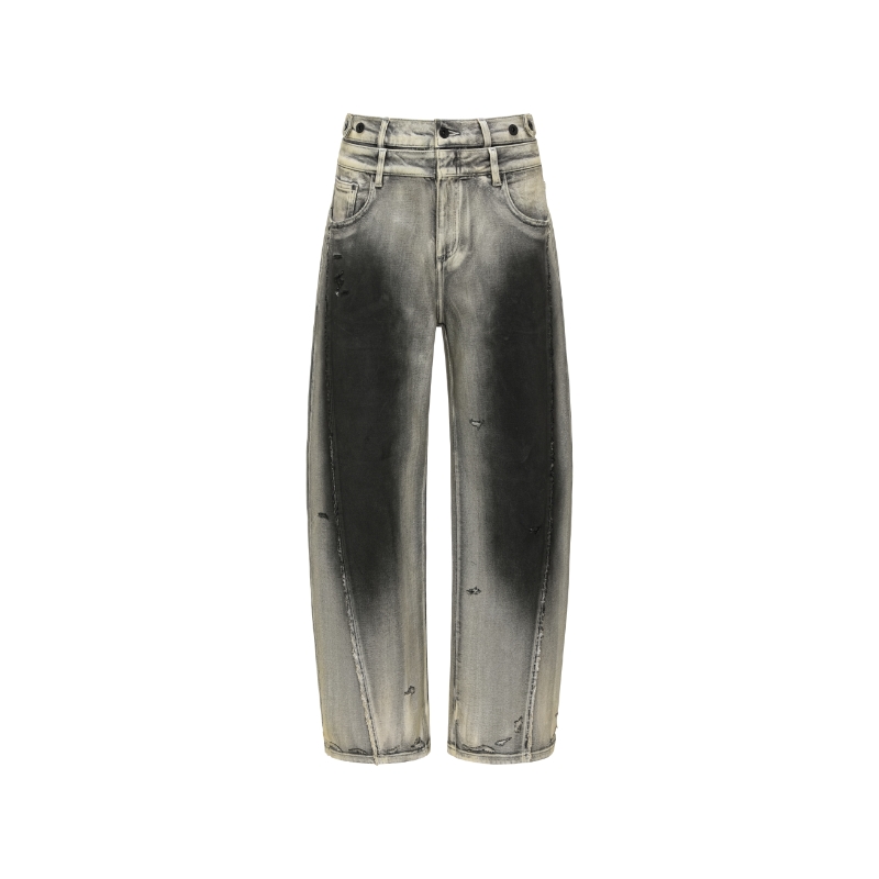 Эти джинсы с градиентным эффектом потертости имеют двойной пояс и свободный, широкий, закругленный крой. Джинсы изготовлены из смеси хлопка и спандекса, а передний шов эффектно удлиняет ноги. Ручная роспись создает эффект черно-белого градиента, а потертости придают общему образу непринужденный уличный стиль.