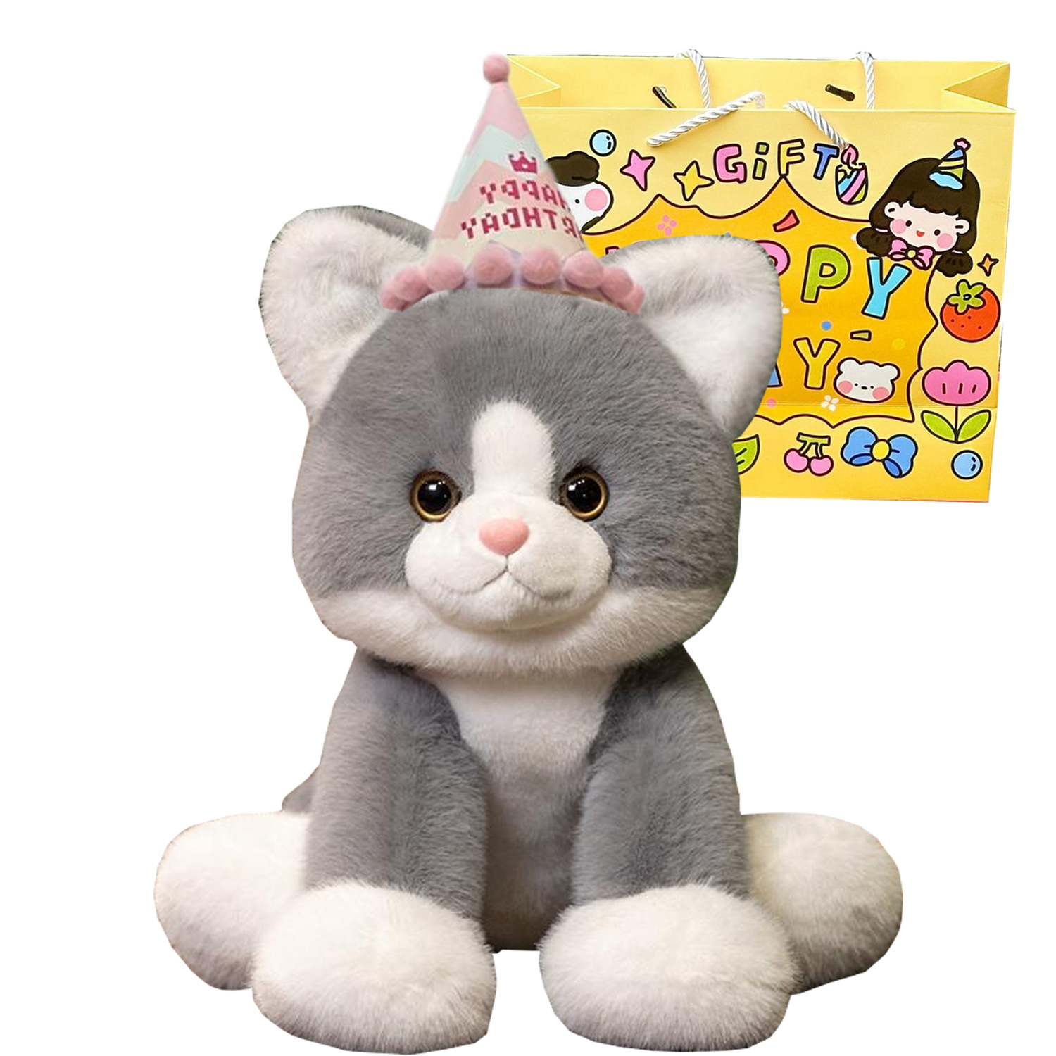 Цвет: серый котенок 35 см + праздничная шапочка + эксклюзивная сумка для покупок