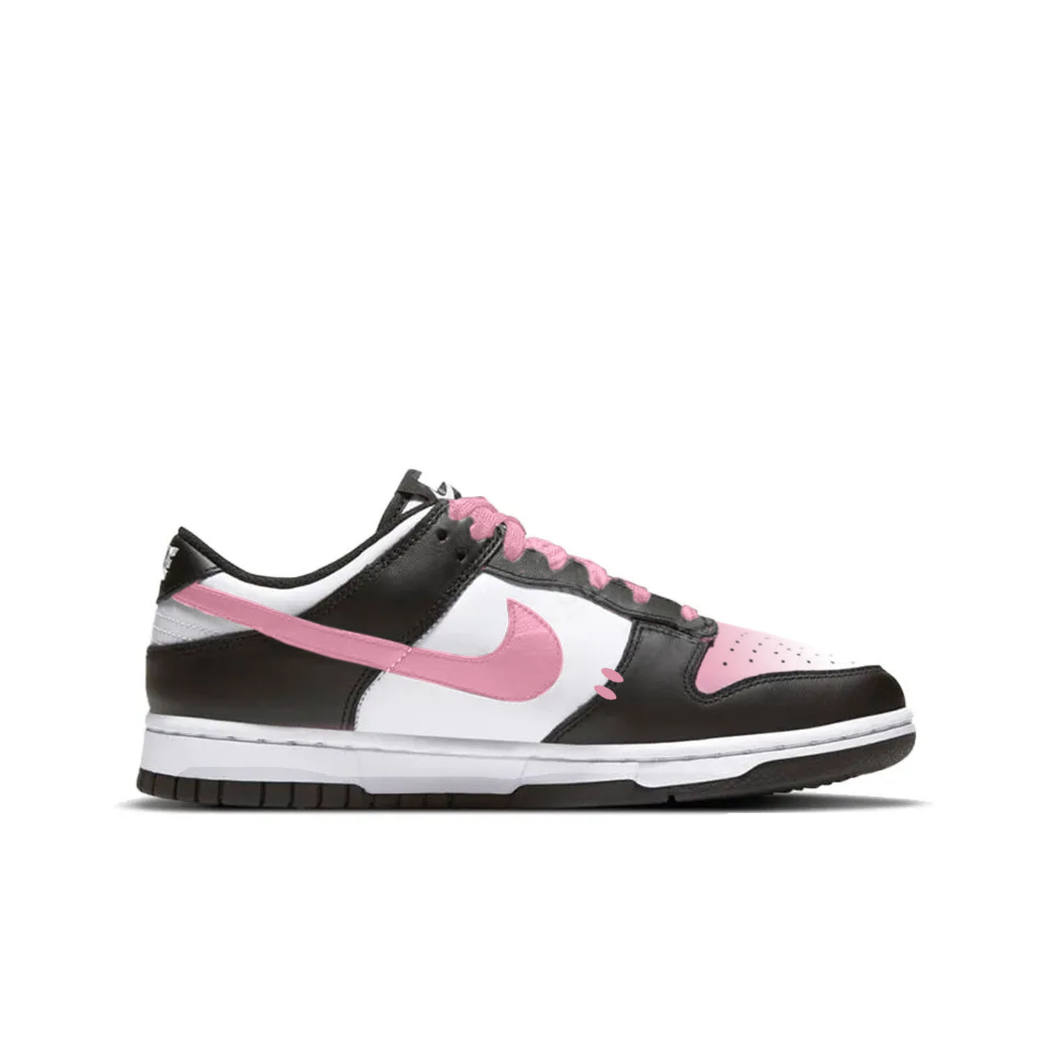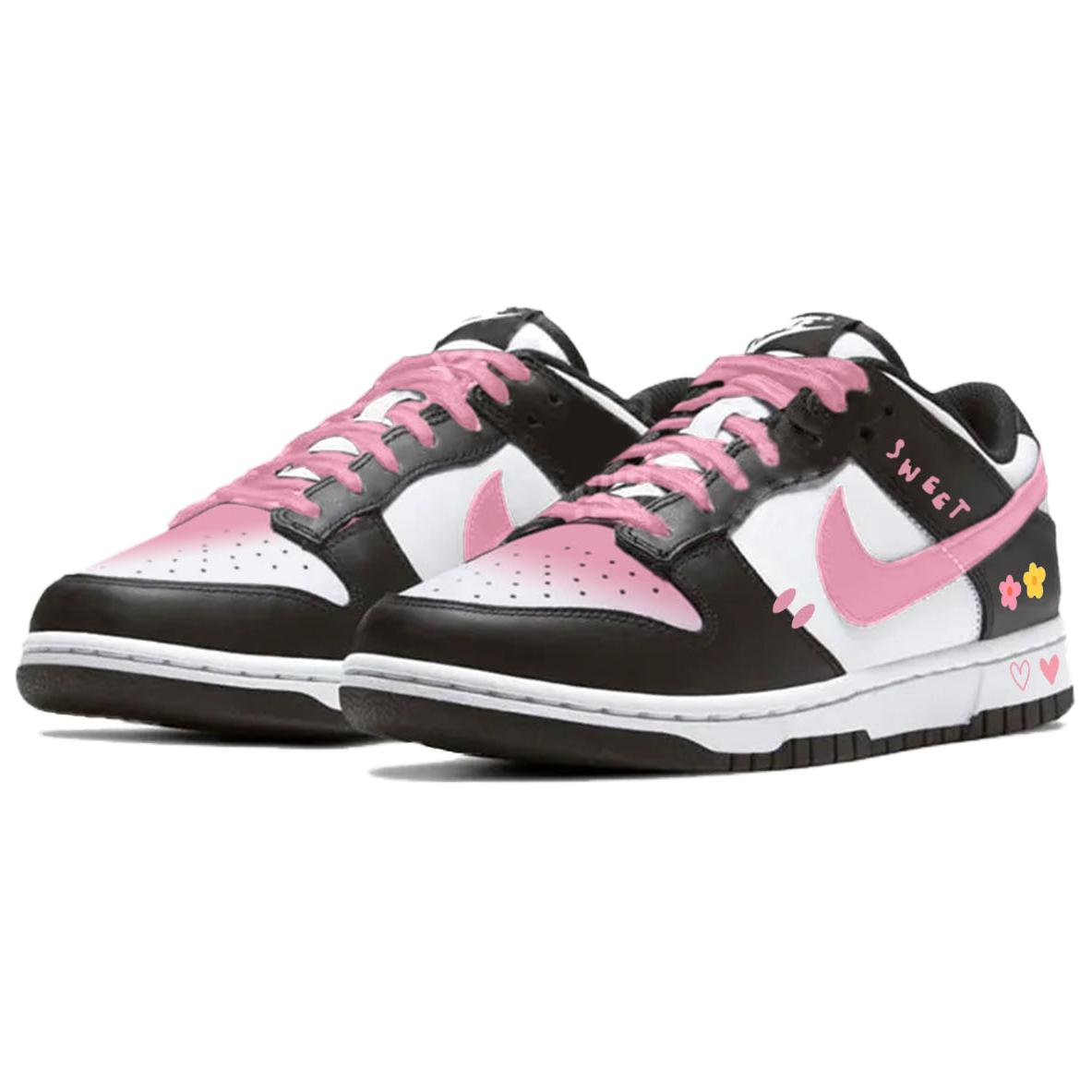 Эти кроссовки изготовлены на заказ на основе оригинальных женских кроссовок Nike Dunk "White/Black" Panda Classic Popular Wear-Night в черно-белом цвете. На простом светло-сером фоне использована классическая черно-белая кожа Nike Dunk Low, а также женственные элементы, такие как розовый логотип Swoosh, шнурки-бантики, надпись "SWEET", цветы и сердечки. В них искусно сочетаются спортивный стиль и милая игривость, а детали ручной работы придают им уникальный индивидуальный вид, демонстрируя индивидуальный стиль.