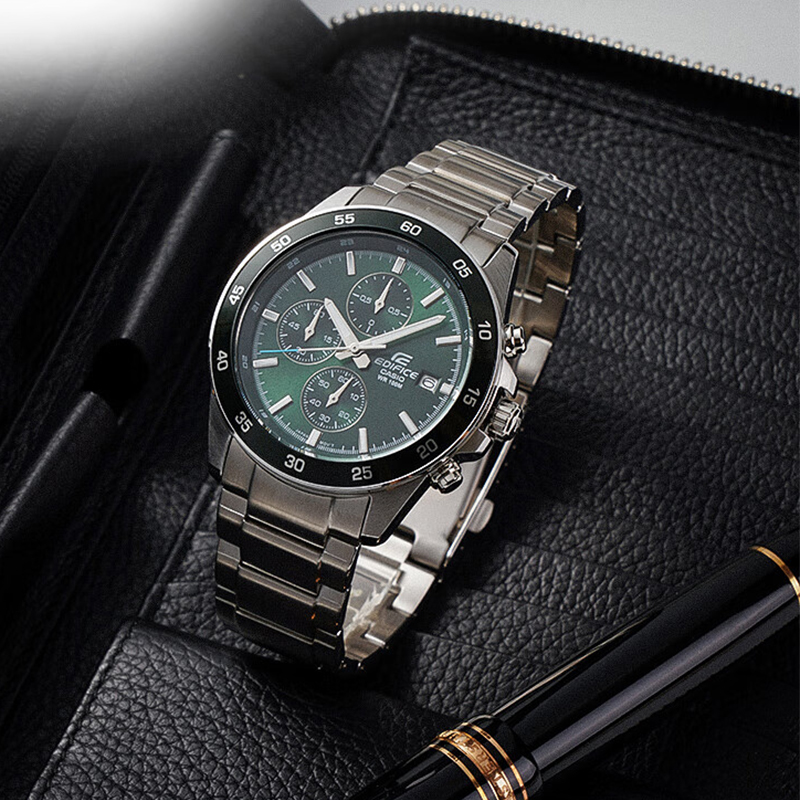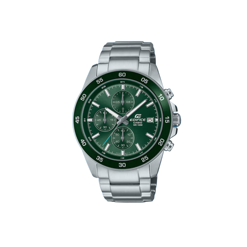 Повысьте свой стиль с классическим хронографом EDIFICE, который отличается корпусом среднего размера и тщательно проработанным дизайном. Прочный браслет из нержавеющей стали сочетается с безелем и циферблатом в изысканном серовато-зеленом оттенке, создавая стильный образ, излучающий тепло.