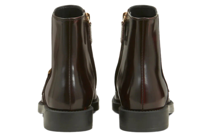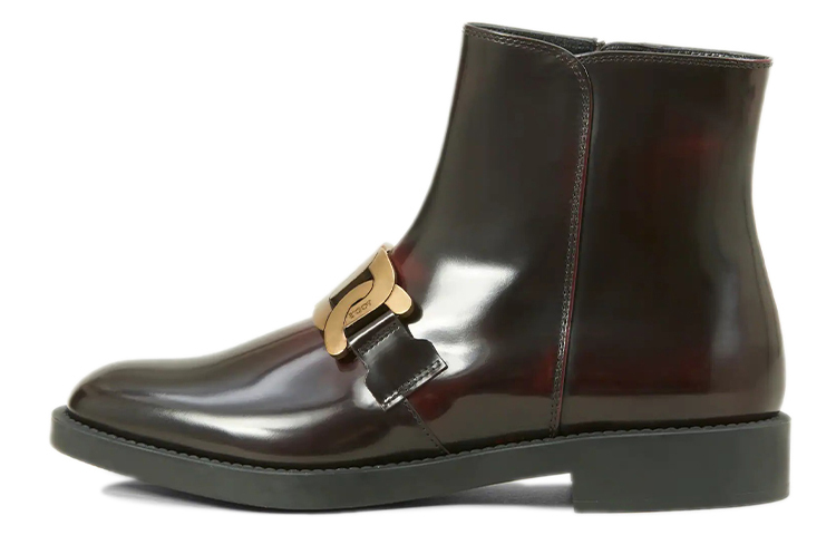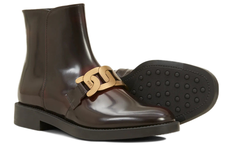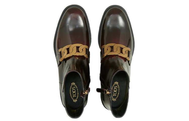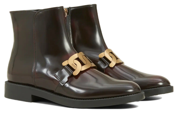 Глянцевый дизайн, отделка цепочкой, молния на щиколотке, короткая молния сбоку, кожаная стелька с логотипом, низкий каблук.