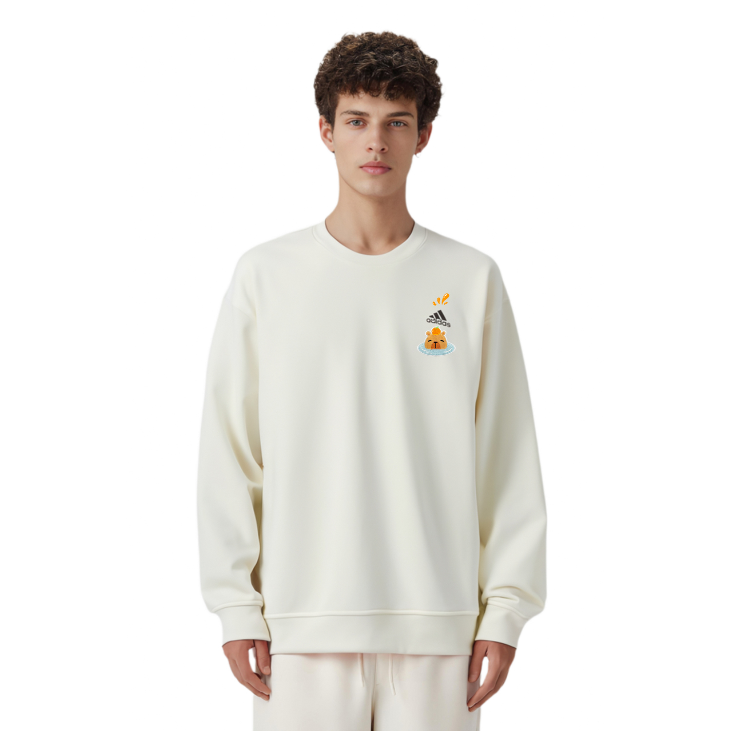 Этот индивидуальный пошив выполнен из оригинальной белой толстовки adidas с круглым вырезом и длинными рукавами, однотонным логотипом. Модель оформлена в новогоднем стиле, подходит для пар и включает в себя изображение очаровательной морской свинки, купающейся в общественной купальне. Ручная вышивка дополняет изысканный образ.