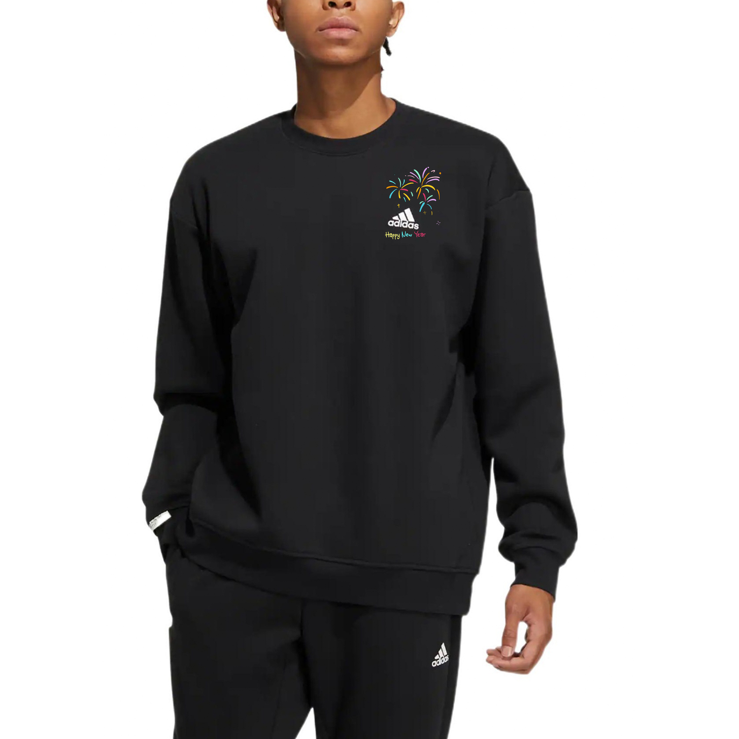 Эта модель, разработанная на заказ, представляет собой оригинальную черную толстовку с круглым вырезом и длинными рукавами с принтом логотипа adidas. Новогодняя тема и красочные фейерверки создают по-настоящему праздничную атмосферу.