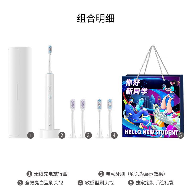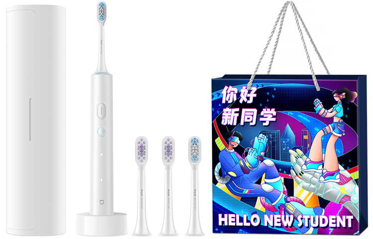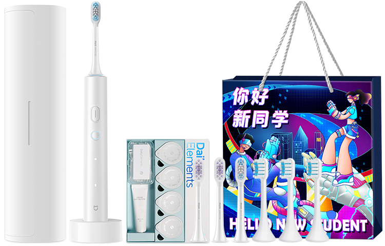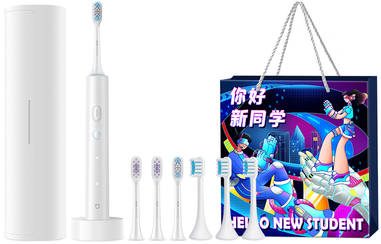 Набор: Белый (включая четыре насадки) с тремя адаптированными насадками + подарочная коробка для полости рта + подарочный пакет для новых одноклассников
