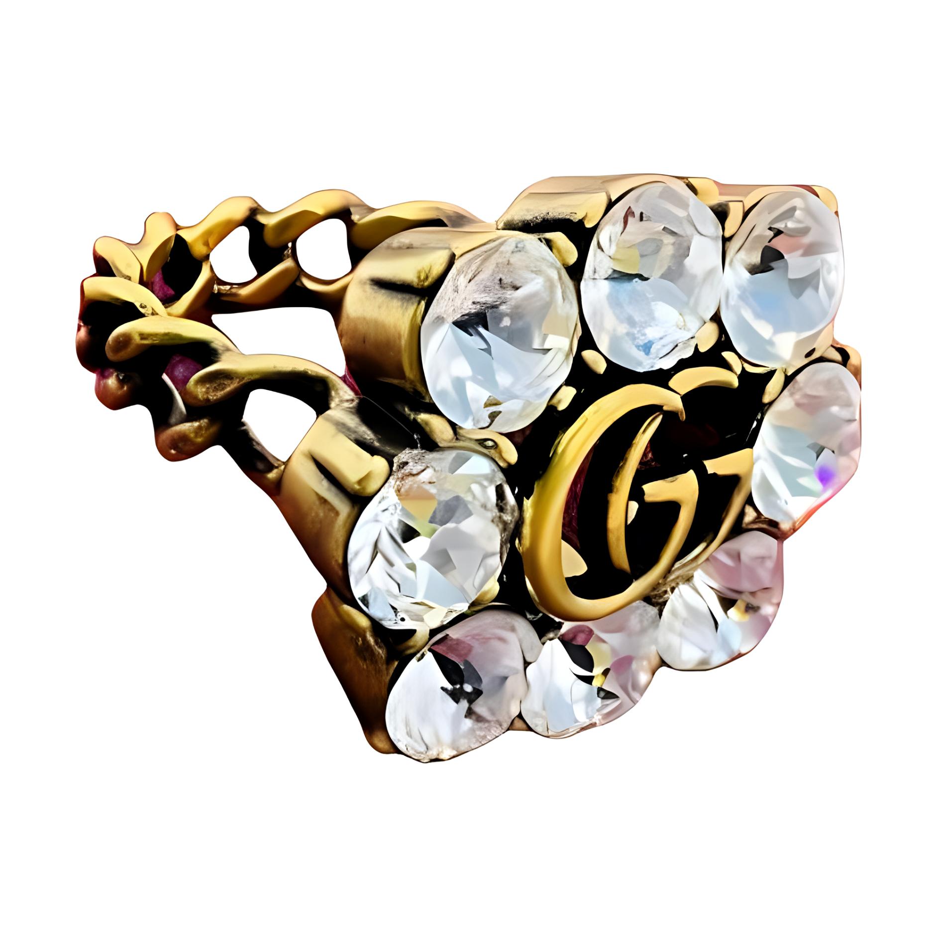 Инициалы основателя Гуччо Гуччи, являющиеся фирменным знаком бренда, представлены на этом кольце в уникальном оформлении. Металлический логотип с потертой позолотой дополняет оправу из прозрачного кристалла, придавая всему дизайну изысканность и элегантность. В этом изделии используется потертость для создания винтажного образа; наличие следов потертости на изделиях, которые вы получаете, является нормой.
