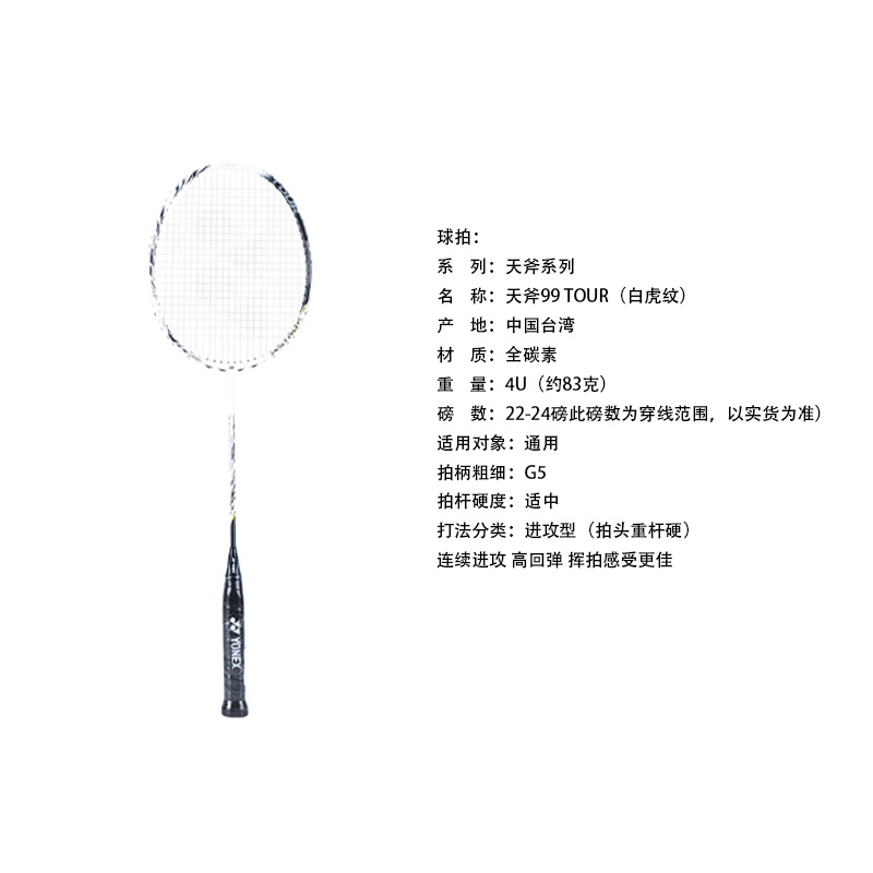 Ракетка: Серия: Название серии Axe: Axe 99 TOUR (White Tiger Stripe) Страна-изготовитель: Тайвань, Китай Материал: Полностью карбон Вес: 4U (прибл. 83 г) Натяжение: 22-24 фунта (данное натяжение является диапазоном натяжения струн и зависит от конкретного продукта) Подходит для: общей Толщина ручки: G5 Жесткость стержня: средняя Стиль игры: наступательный (тяжелая головка, жесткий стержень) Непрерывная атака с высоким отскоком для лучшего ощущения замаха. Волан: Воланы YONEX прочные, эластичные, не трескаются и более долговечные.