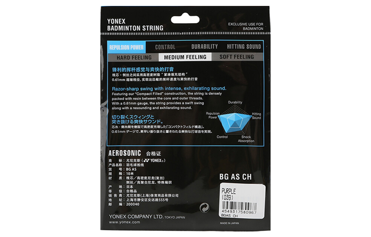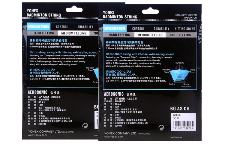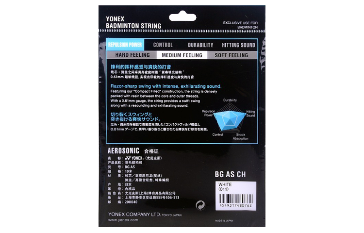 Высокоэластичная, прочная бадминтонная струна YONEX BGASCH диаметром 0,61 мм обеспечивает четкость ощущений и высокий отскок для легкой защиты.