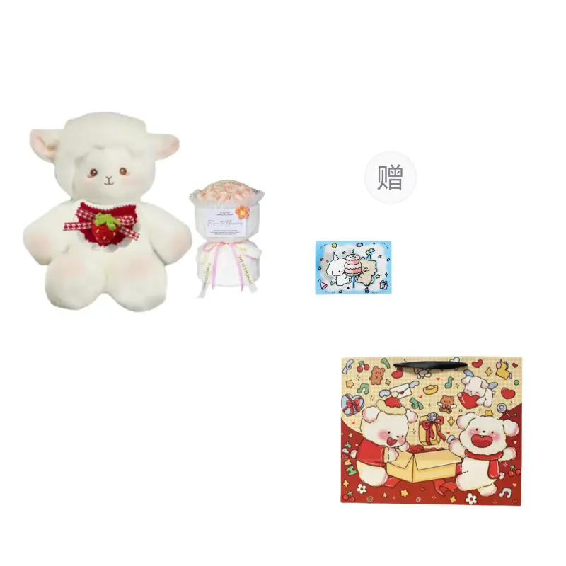Название продукта: Клубничный нагрудник с ягненком и букетом розовых роз (включая поздравительную открытку с изображением щенка)