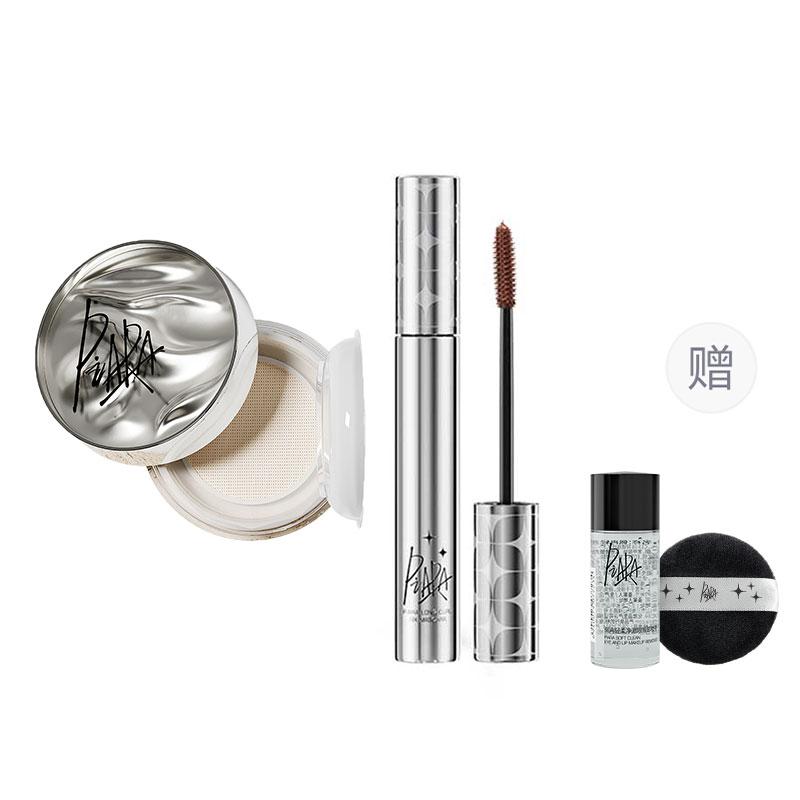 Набор: рассыпчатая пудра Nude + удлиняющая коричневая тушь для ресниц, включает очищающее средство для глаз и губ + пуховку