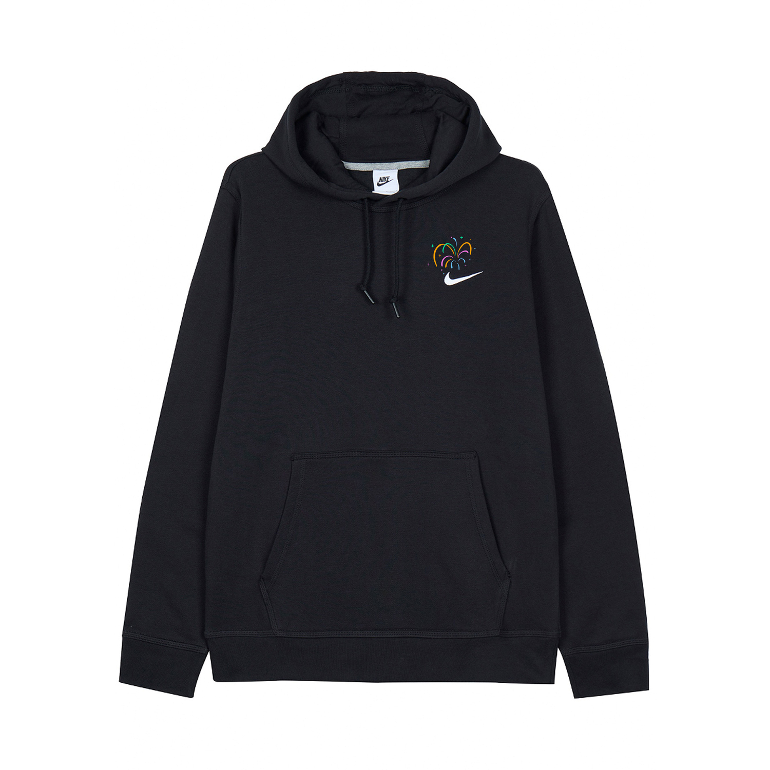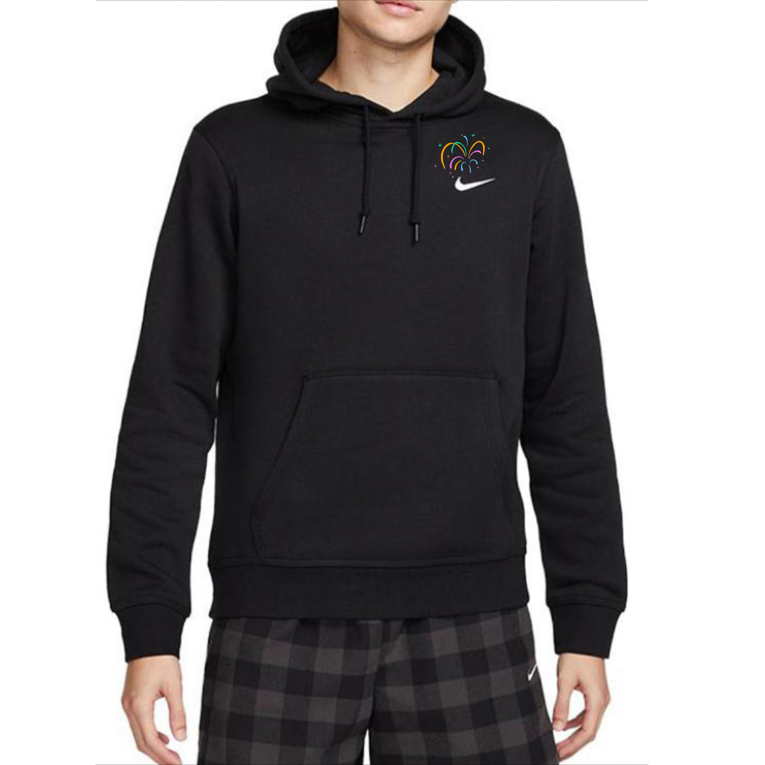 Эта модель, сшитая на заказ, создана на основе оригинальной толстовки Nike с капюшоном и длинными рукавами на флисовой подкладке, унисекс, черного цвета. Ослепительные фейерверки в новогодней тематике создают чудесную праздничную атмосферу.