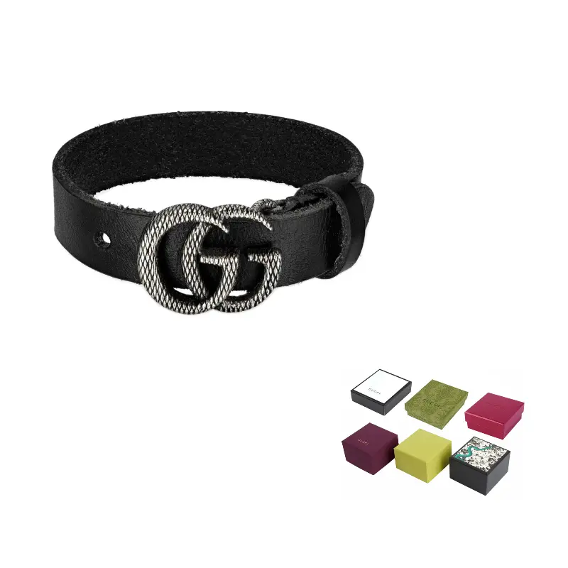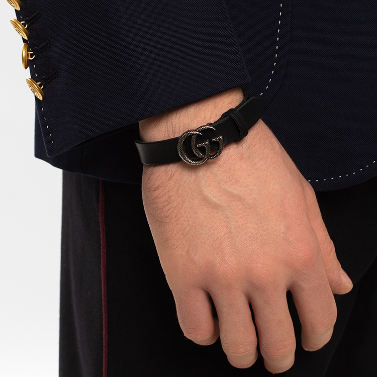 Этот черный кожаный браслет представляет собой новую интерпретацию культового элемента двойной буквы G, придавая классическому дизайну новое очарование. Изделие имеет состаренную отделку, что придает ему винтажный вид; потертости на изделиях, которые вы получаете, - это нормально.