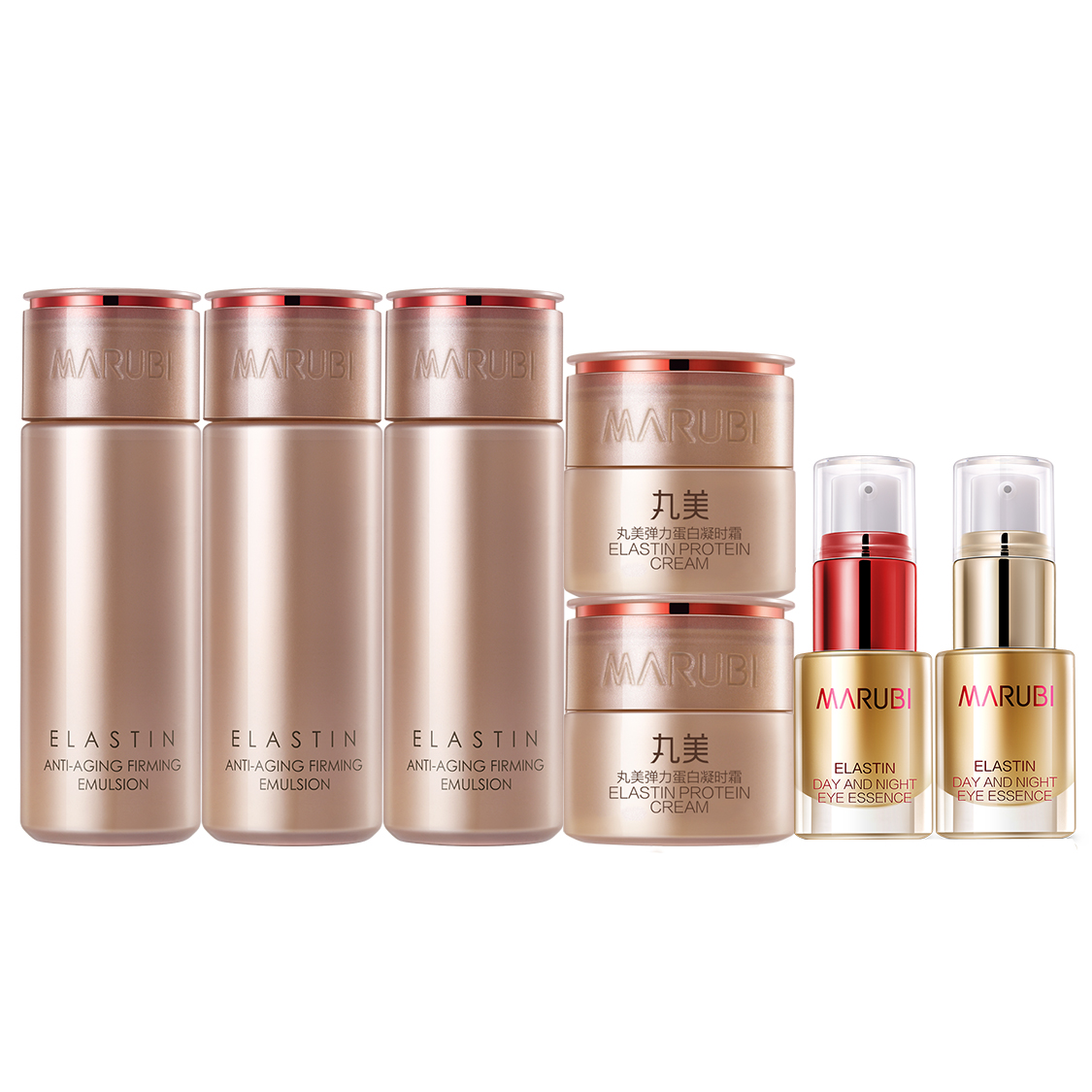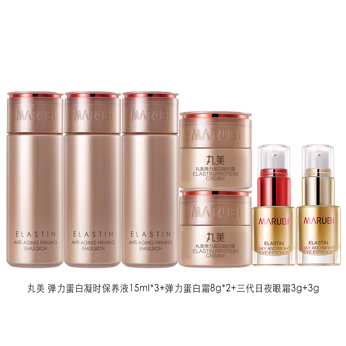 Характеристики: Раствор для коагуляции эластина + крем для упругости кожи + набор кремов для кожи вокруг глаз 3-го поколения: дневной и ночной.