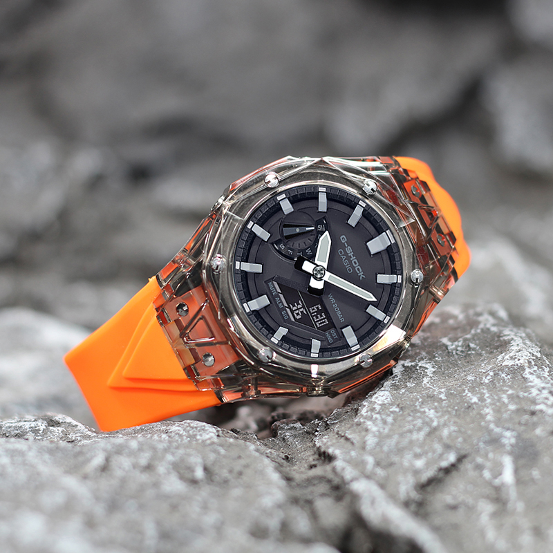 Цвет ремешка: черный прозрачный корпус часов, красный резиновый ремешок