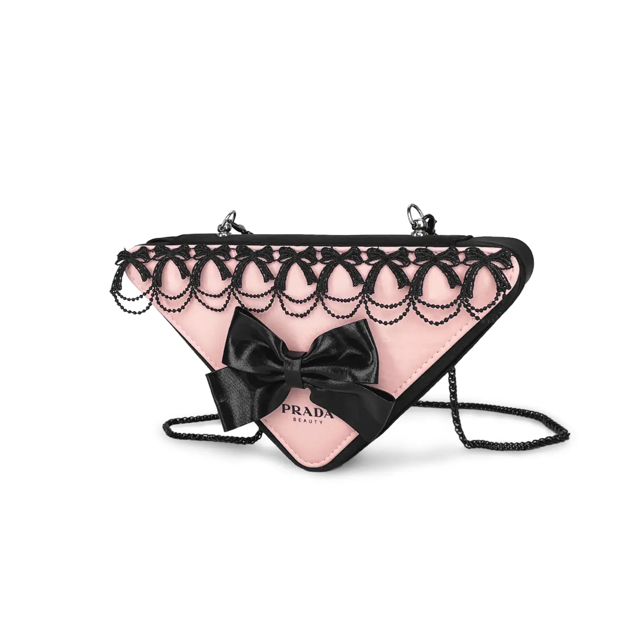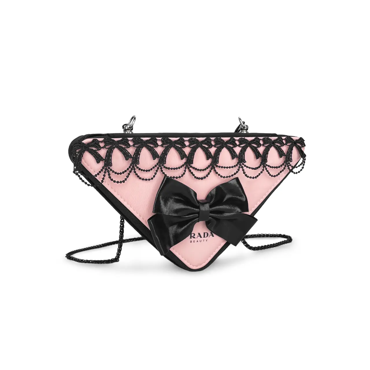 Эта косметичка, изготовленная на заказ, создана на основе оригинальной треугольной косметички PRADA, удобной для хранения и переноски косметических принадлежностей. Артикул: «Triangle Cosmetic Bag». Дизайн «Rebellious Sweetheart» поражает своим эффектным внешним видом. Основная часть косметички выполнена в нежно-розовом цвете, словно фон сладкого сна, создавая нежную и сладкую атмосферу. Черный бант, кружевные украшения и ремешок-цепочка словно мятежные чернильные брызги на этом нежном холсте. Изящный и объемный бант, замысловатое кружево, прочная и аккуратная цепочка создают эффектный контраст с розовым корпусом и нарушают монотонность традиционных сладких стилей. Общая форма уникальна, а новая треугольная форма - это заявление об индивидуальности, словно освобождающее от традиционных конструкций. Она идеально интерпретирует тему «Rebellious Sweetheart», сохраняя девичье очарование и демонстрируя непринужденный подход к моде.