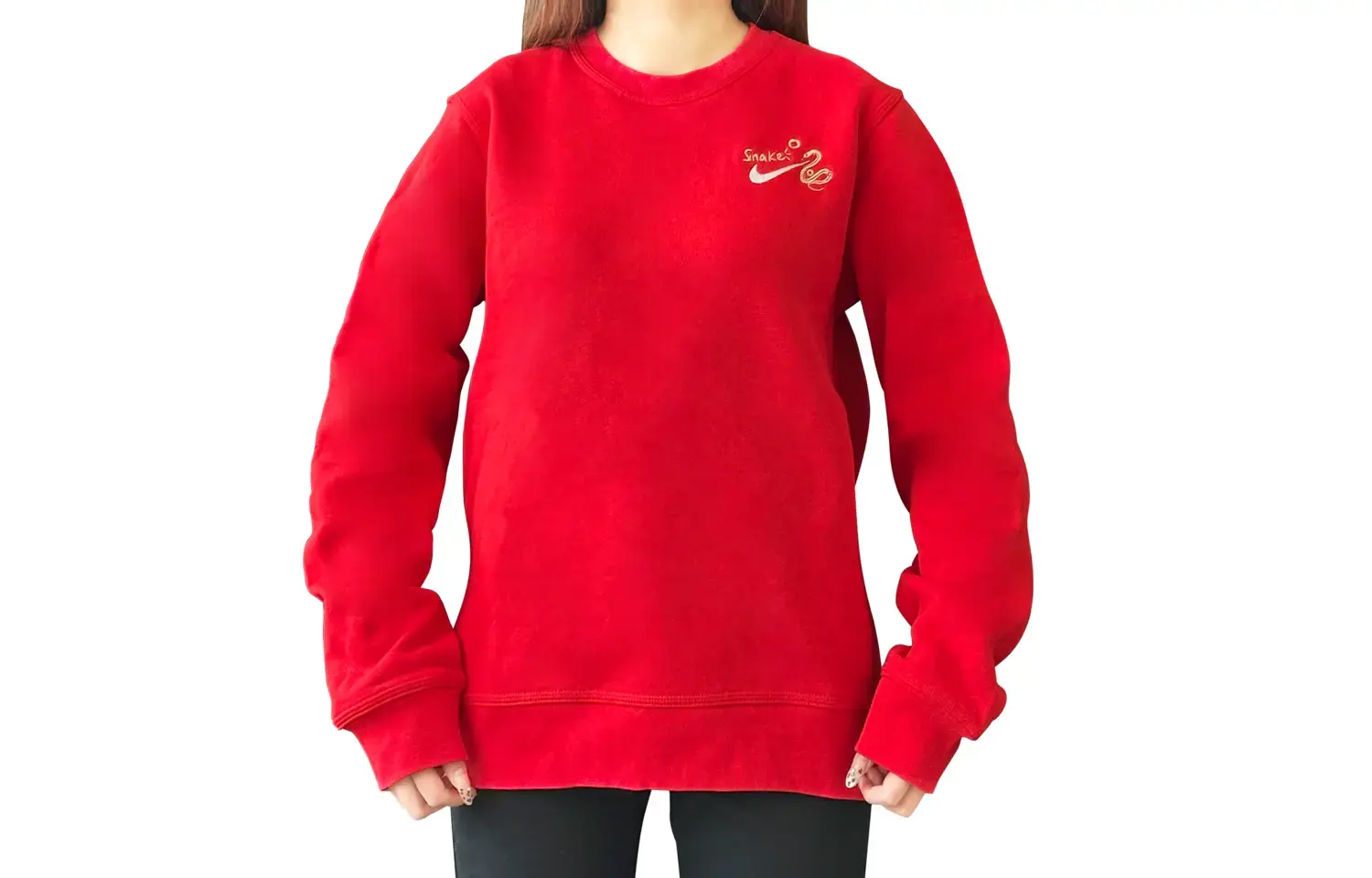 Эта фирменная одежда выполнена в оригинальном однотонном красном свитшоте с вышитым логотипом Nike. Вдохновленная традиционной культурой Китая, змея символизирует мудрость, богатство и долголетие, а золотая змея - благородство и процветание. «Золотая змея приносит благословение» означает бесконечную удачу и богатство. В ней классические элементы змеи сочетаются с традиционными благоприятными узорами, такими как тыква-горлянка, что передает прекрасное пожелание «бесконечного и непрерывного благословения и процветания».