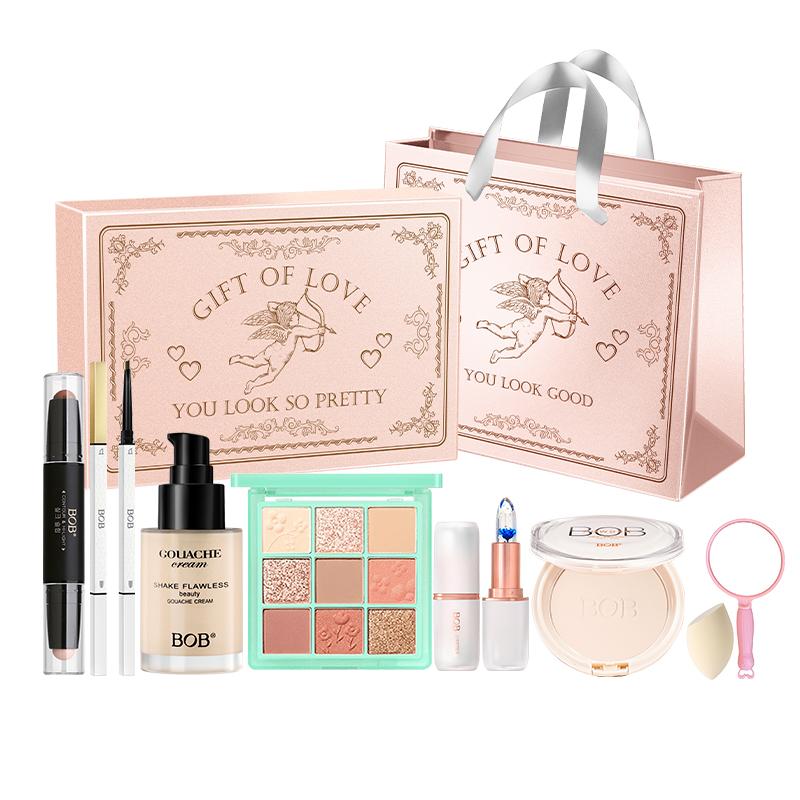 Набор: 【Естественный цвет лица】Жидкая тональная основа + Пудра + Палитра теней для век + Цветочная помада + Хайлайтер-карандаш + Карандаш для бровей