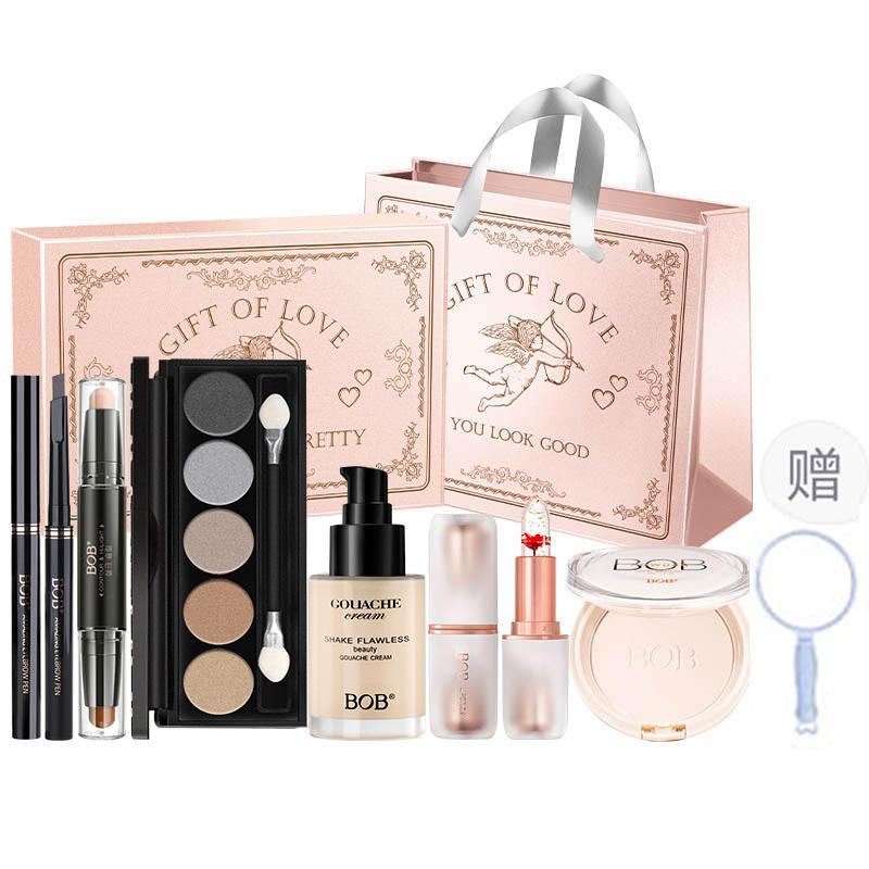 Набор: 【Светлый цвет лица】Жидкая тональная основа + пудра + палетка теней для век + цветочная помада + хайлайтер + карандаш для бровей