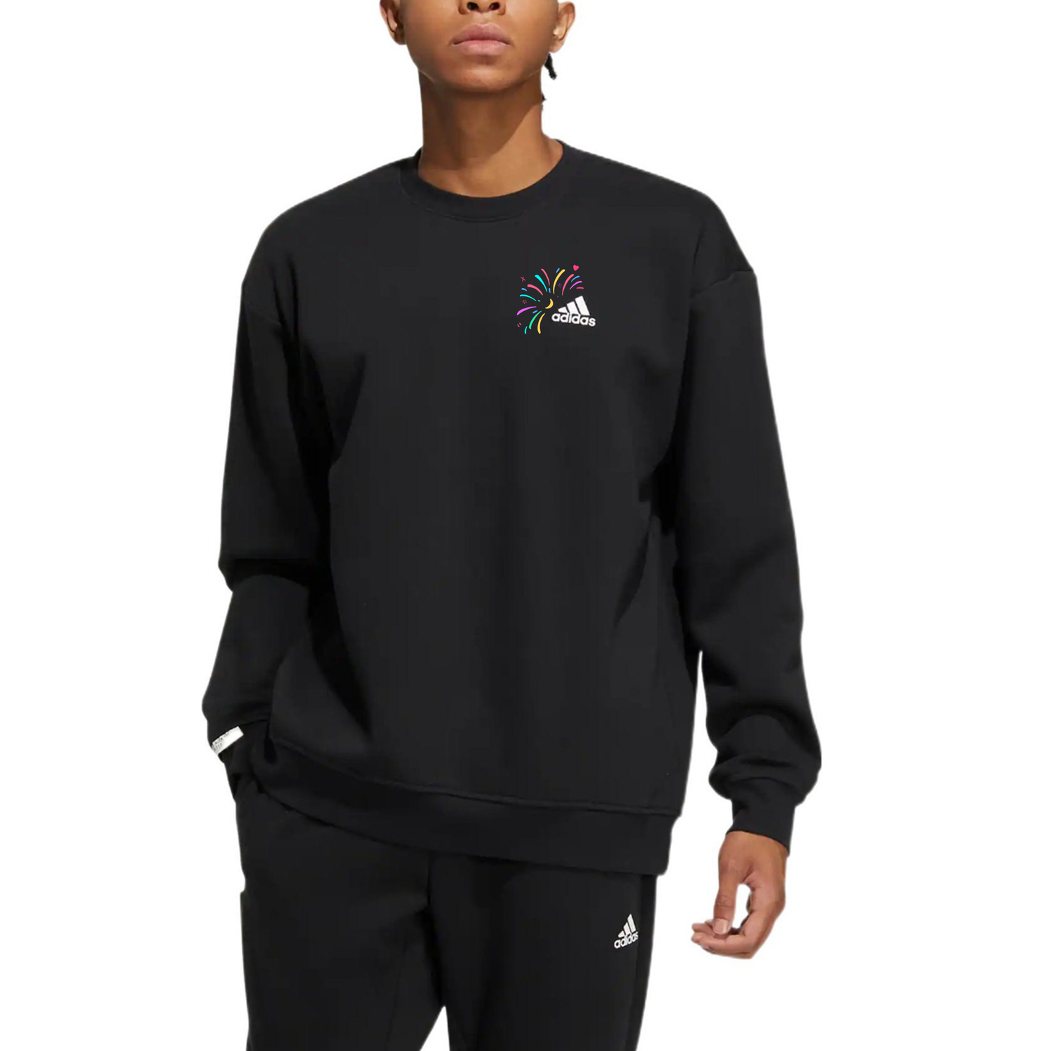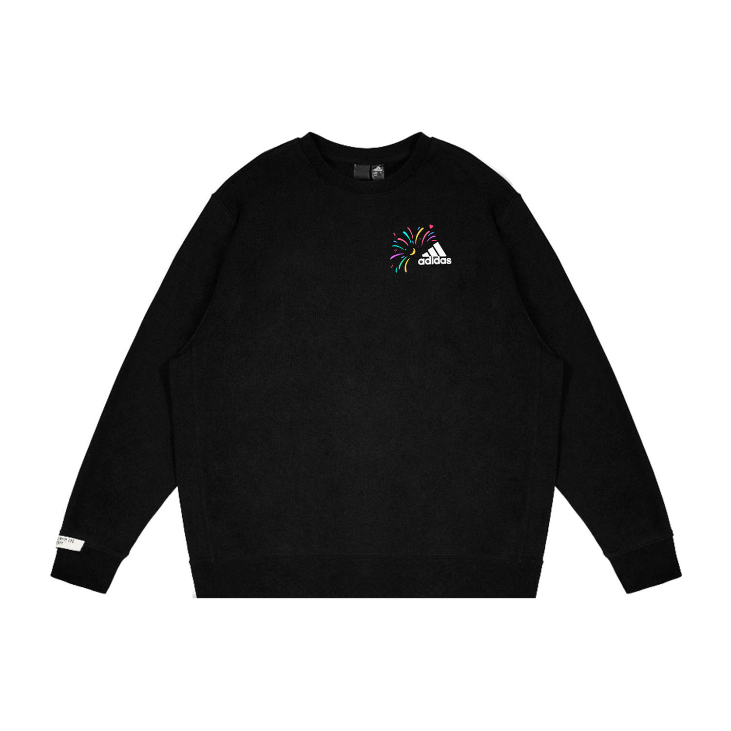 Эта модель, разработанная на заказ, представляет собой оригинальную черную толстовку с круглым вырезом и длинными рукавами с принтом логотипа adidas. Новогодняя тема и красочные фейерверки создают по-настоящему праздничную атмосферу.
