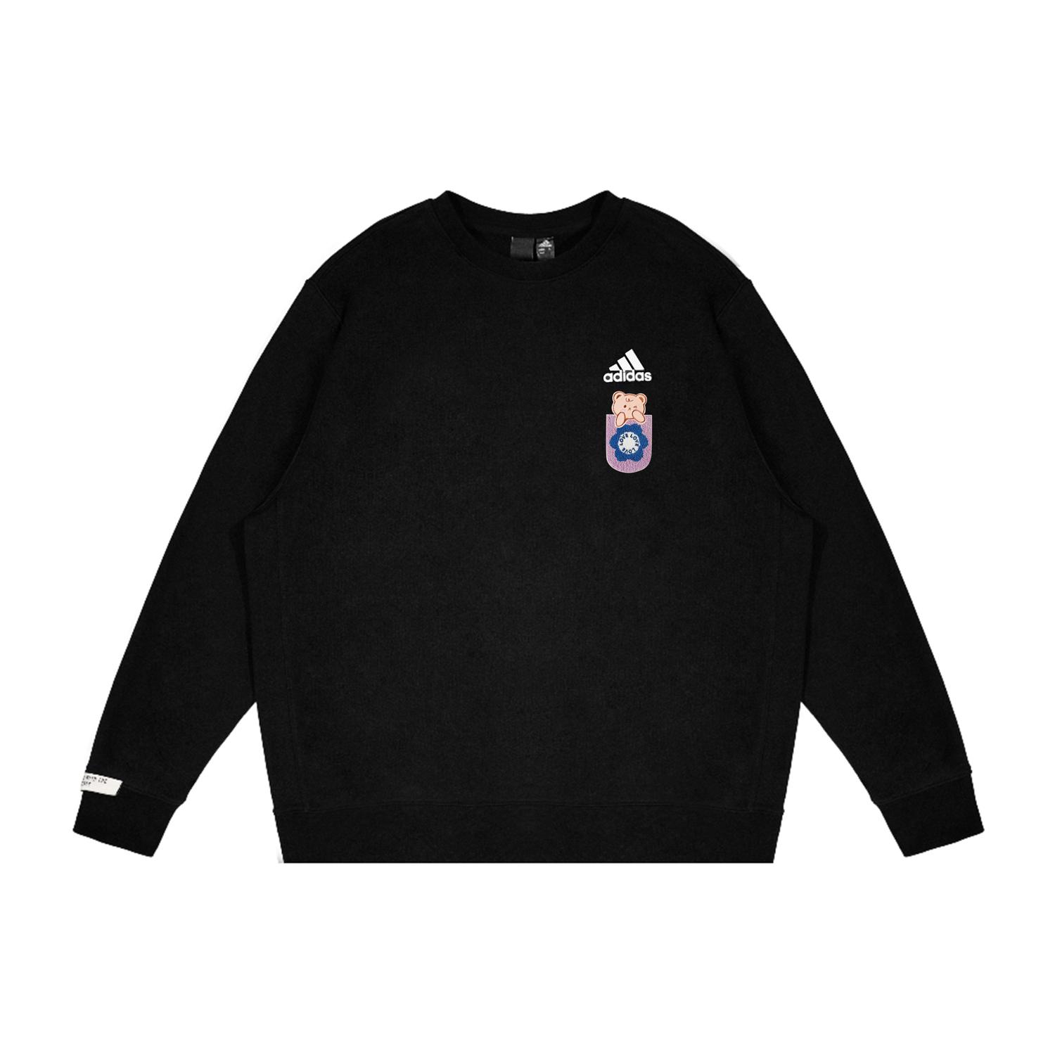 Этот сшитый на заказ предмет одежды создан на основе оригинальной черной толстовки с круглым вырезом и длинными рукавами с логотипом adidas. Модель отличается карманами, неровной пэчворк-конструкцией и изысканной ручной вышивкой.