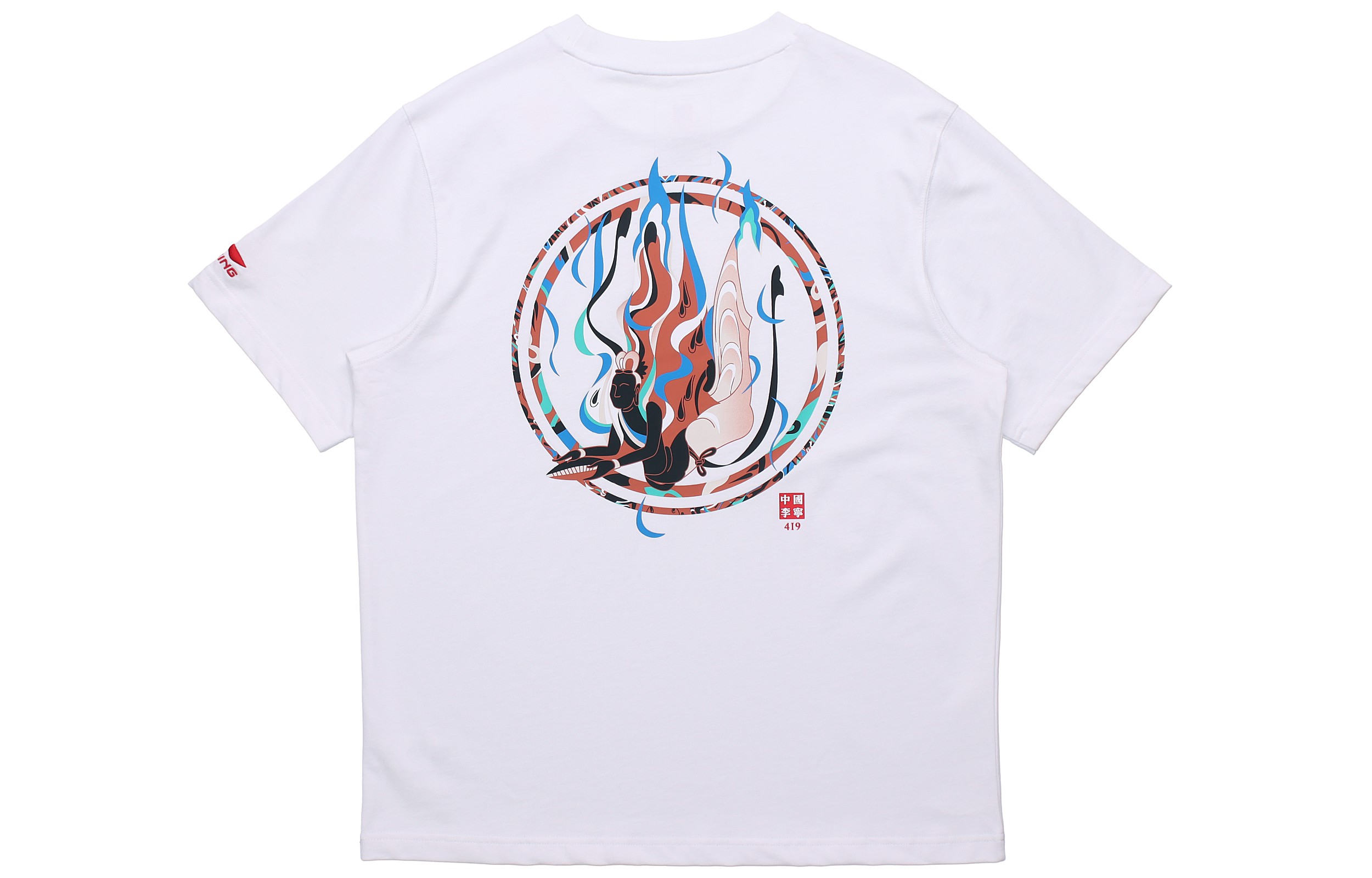 Футболки с короткими рукавами из весенне-летней коллекции Li-Ning 2020, представленные на Неделе моды в Париже, отличаются простыми цветовыми сочетаниями, создавая минималистичный, но стильный образ. Передняя часть украшена принтами, вдохновленными Дуньхуаном, а спинка украшена принтом «Летящие апсары из ниши династии Суй» из гротов Могао. Тщательная и детальная техника росписи оживляет статичный рисунок, позволяя классическим древнекитайским элементам расцвести на обладательнице.