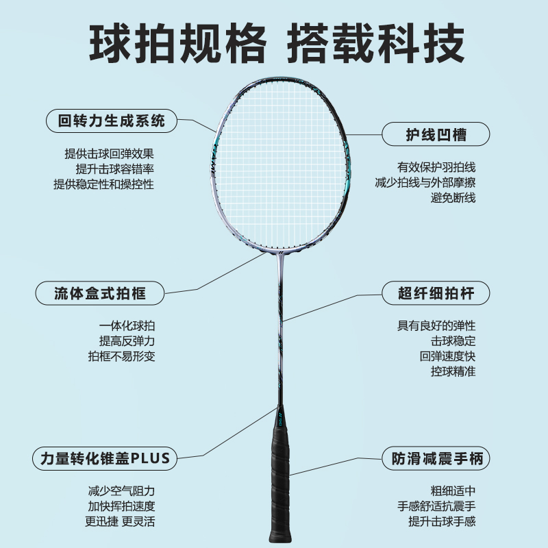 Характеристики аксессуара: защитная лента *1 Коробка/набор: одна ракетка + сумка для ракетки Натяжение струн: Натяжение струн (22-0 фунтов) Вес без струн/Размер рукоятки: 4U/G5