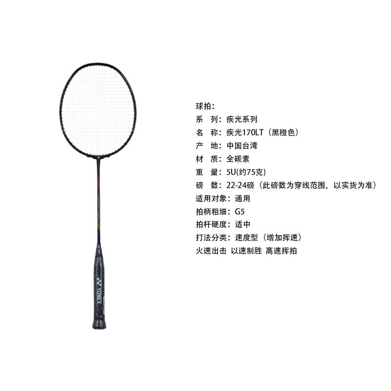Ракетка: Серия: Lightning Название серии: Lightning 170LT (черно-оранжевый) Страна-изготовитель: Тайвань, Китай Материал: полностью карбоновый Вес: 5U (прибл. 75 г) Натяжение: 22-24 фунта (данное натяжение является диапазоном натяжения струн в зависимости от фактического продукта) Подходит для: универсальной Толщина ручки: G5 Жесткость стержня: средняя Стиль игры: скоростной (увеличивает скорость замаха) Быстрая атака для победы Высокоскоростной бадминтон: воланы YONEX прочные, эластичные, их нелегко сломать, и они более долговечны.