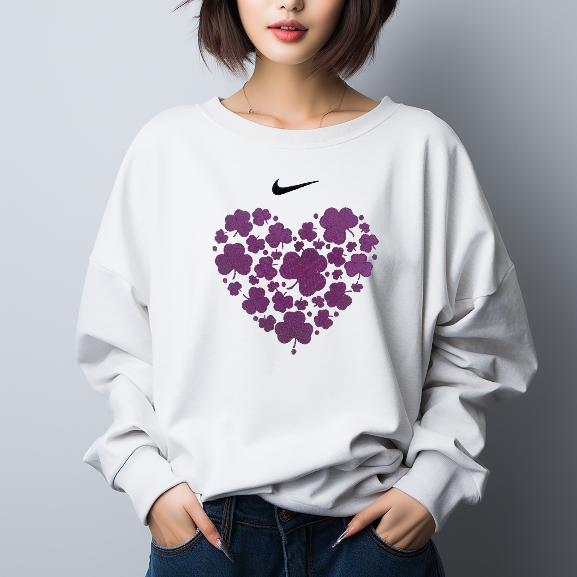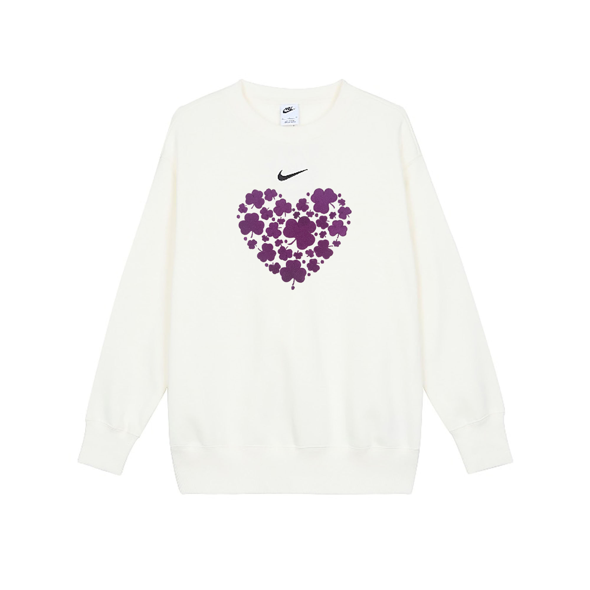 Эта модель, сшитая на заказ, представляет собой однотонную женскую толстовку Nike с круглым вырезом, флисовой подкладкой и длинными рукавами, в цвете «парусный белый». Вдохновленная оригинальными, персонализированными дизайнами, она обладает яркой визуальной привлекательностью.
