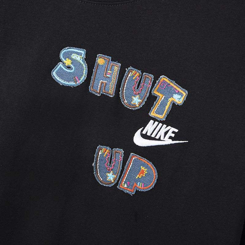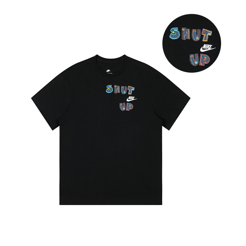 Этот индивидуальный дизайн основан на оригинальной мужской футболке Nike с короткими рукавами, круглым вырезом и вышитым логотипом Nike. Вдохновением послужила пародия на песню «Shut Up».