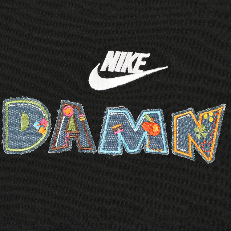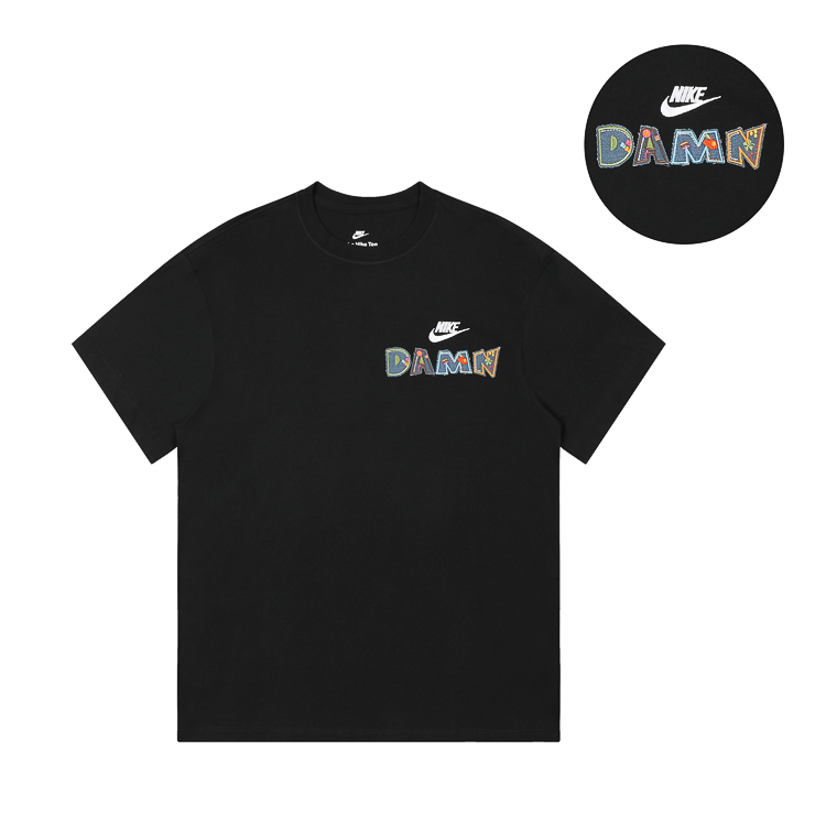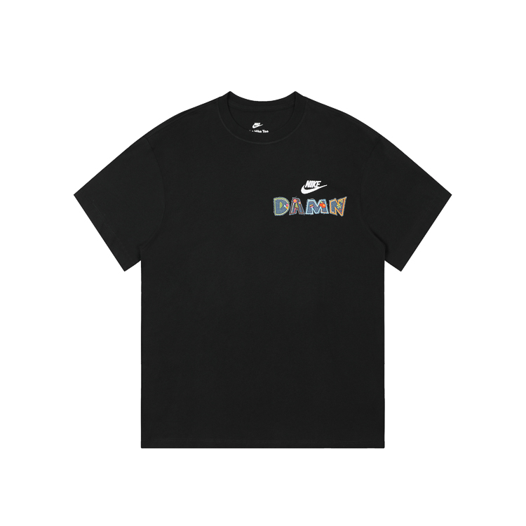 Этот индивидуальный дизайн основан на оригинальной мужской футболке Nike с вышитым логотипом и короткими рукавами, круглым вырезом и стандартными плечами. Вдохновение пришло из DAMN.