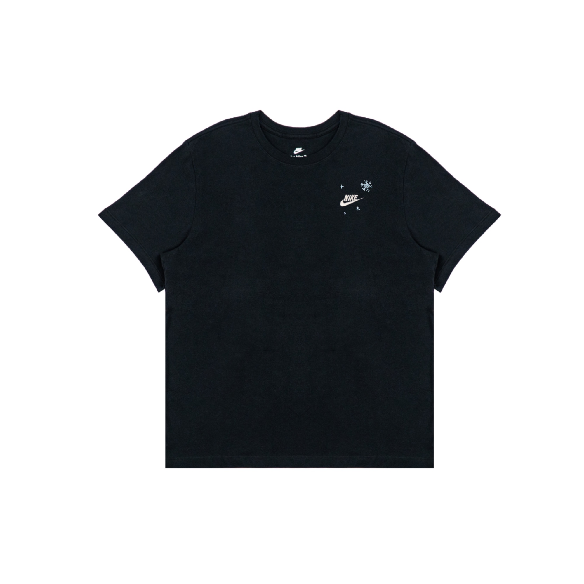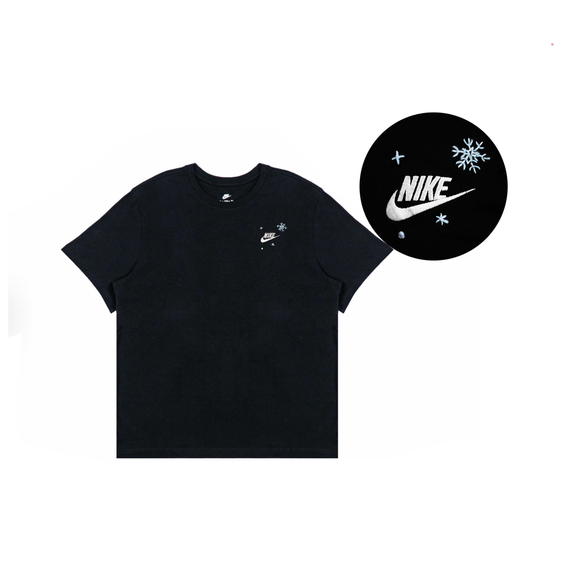 Эта модель, разработанная на заказ, представляет собой оригинальную мужскую футболку Nike с вышитым логотипом и короткими рукавами, круглым вырезом и стандартной длиной плеч, черного цвета. Вдохновением послужили снежинки.
