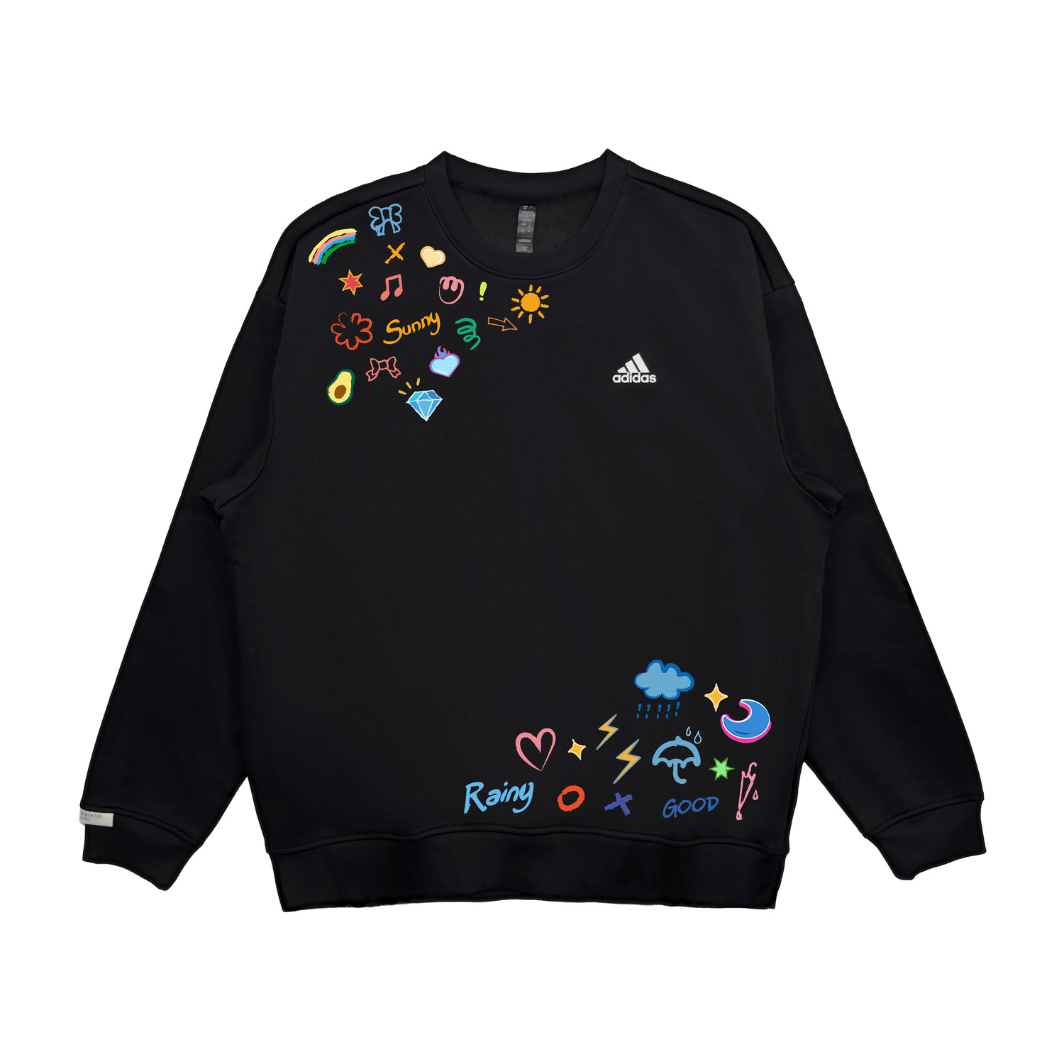 Этот сшитый на заказ предмет одежды выполнен из оригинальной толстовки с круглым вырезом и длинными рукавами с принтом логотипа adidas LABEL, унисекс, черного цвета. Вдохновением послужили нарисованные от руки граффити, сочетающие в себе элементы погоды и повседневных вещей с надписями «Дождливый» и «Солнечный», создавая игривый и непринужденный модный образ. Узоры на каждом изделии наносятся вручную, поэтому расположение узоров на разных изделиях может незначительно отличаться. В связи с особенностями процесса и материалов, пожалуйста, избегайте контакта с острыми предметами, длительного замачивания и сушки при высоких температурах.
