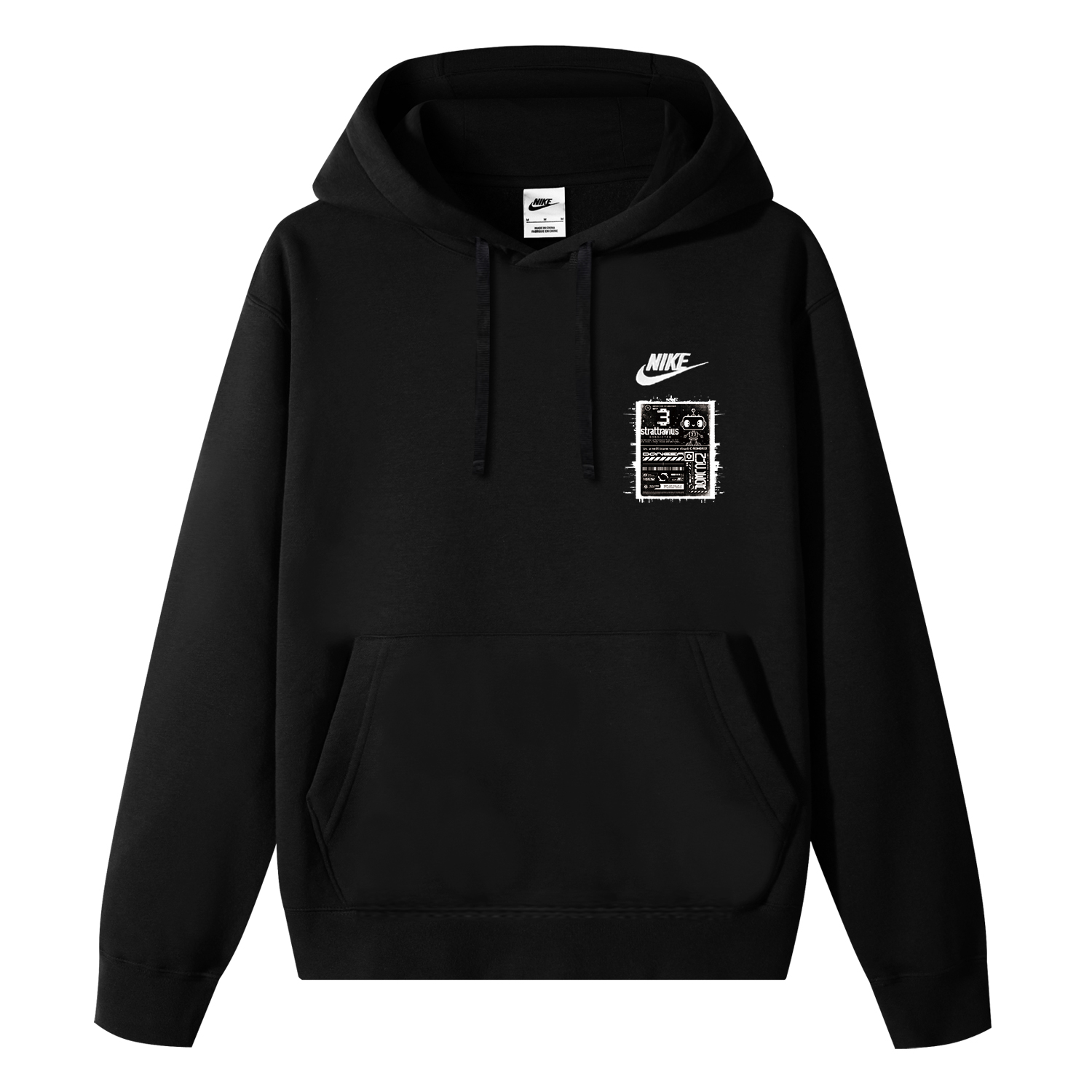 Этот индивидуальный дизайн основан на оригинальной толстовке с капюшоном Nike Sportswear Club Fleece на флисовой подкладке черного цвета. Оригинальный дизайн, доступный эксклюзивно на Dewu, значительно снижает вероятность того, что кто-то наденет такой же наряд.
