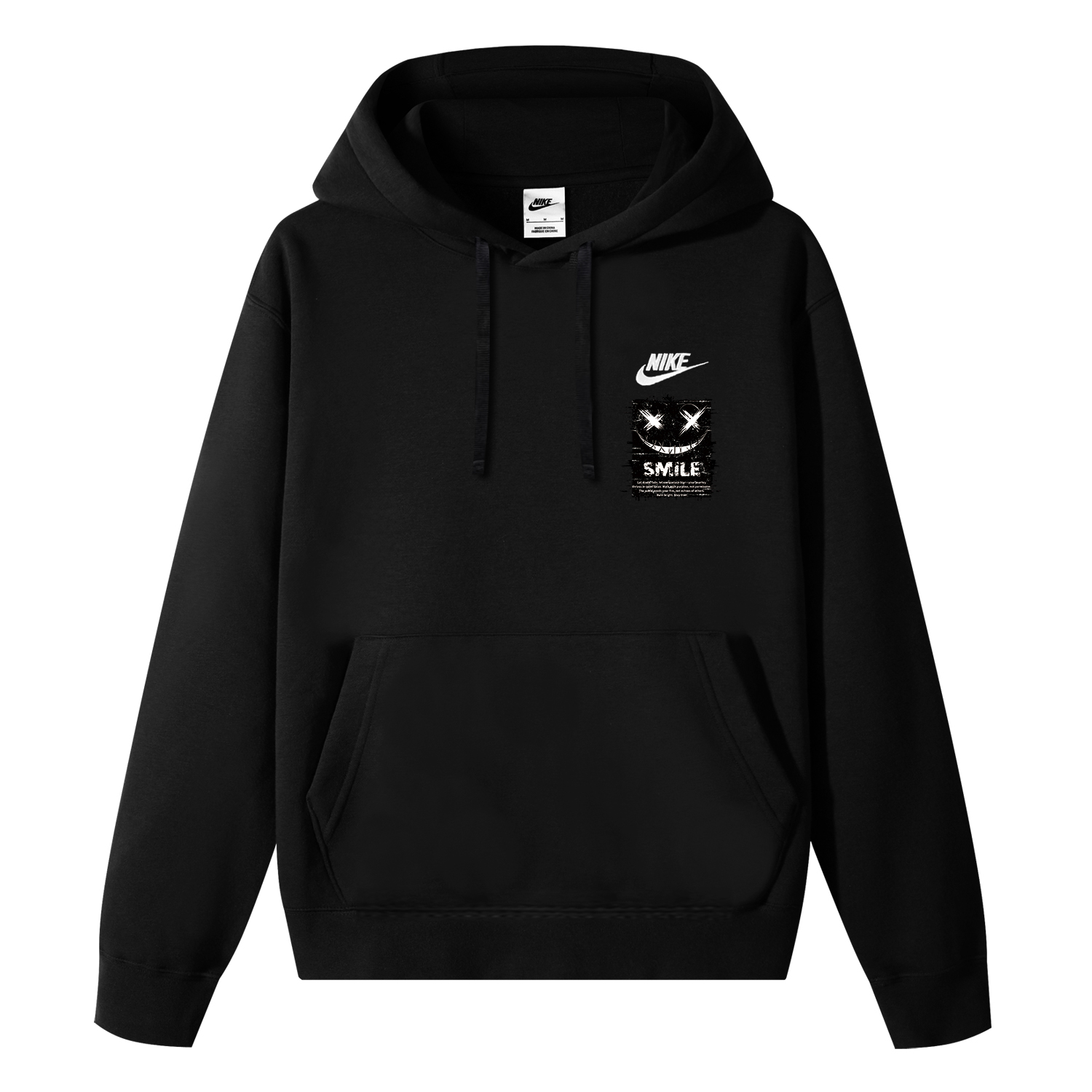 Этот индивидуальный дизайн основан на оригинальной толстовке с капюшоном Nike Sportswear Club Fleece на флисовой подкладке черного цвета. Оригинальный дизайн, доступный эксклюзивно на Dewu, значительно снижает вероятность того, что кто-то наденет такой же наряд.
