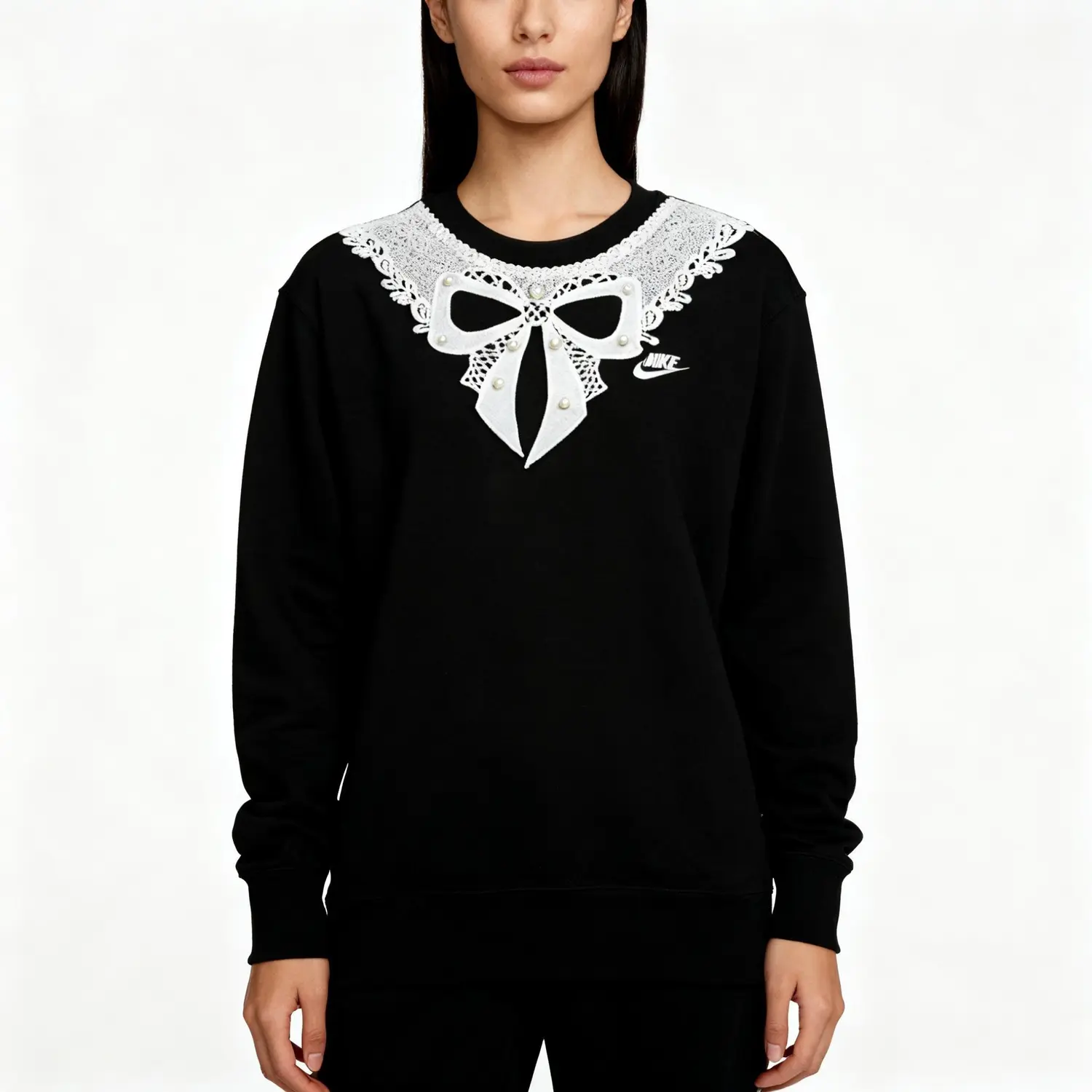 Этот сшитый на заказ предмет одежды представляет собой повседневную мужскую толстовку с длинными рукавами и круглым вырезом с логотипом Nike Sportswear, весенний стиль, черный. Вдохновение черпается из деталей: от «повседневных болевых точек» до «личного самовыражения». Многие любят комфорт спортивной одежды, но также хотят выразить уникальную эстетику в своих повседневных нарядах, но им сложно найти вещи, которые бы сбалансировали и то, и другое. Детали этой модели отвечают этой потребности: 1. Выбор кружева: отказ от мелкой вышивки в пользу большого кружевного воротника обеспечивает достаточное выделение милого элемента, чтобы он не «потонул» в спортивной основе. Винтажная текстура кружева также добавляет нотку изысканности, отличая его от тонкости типичных милых стилей. 2. Добавление банта: объемный бант не является лишним украшением, а служит «точкой опоры» для баланса стиля. Он еще больше подчеркивает мягкость кружева, создавая визуальный контраст со шнурком, ребристыми манжетами и другими спортивными деталями толстовки.