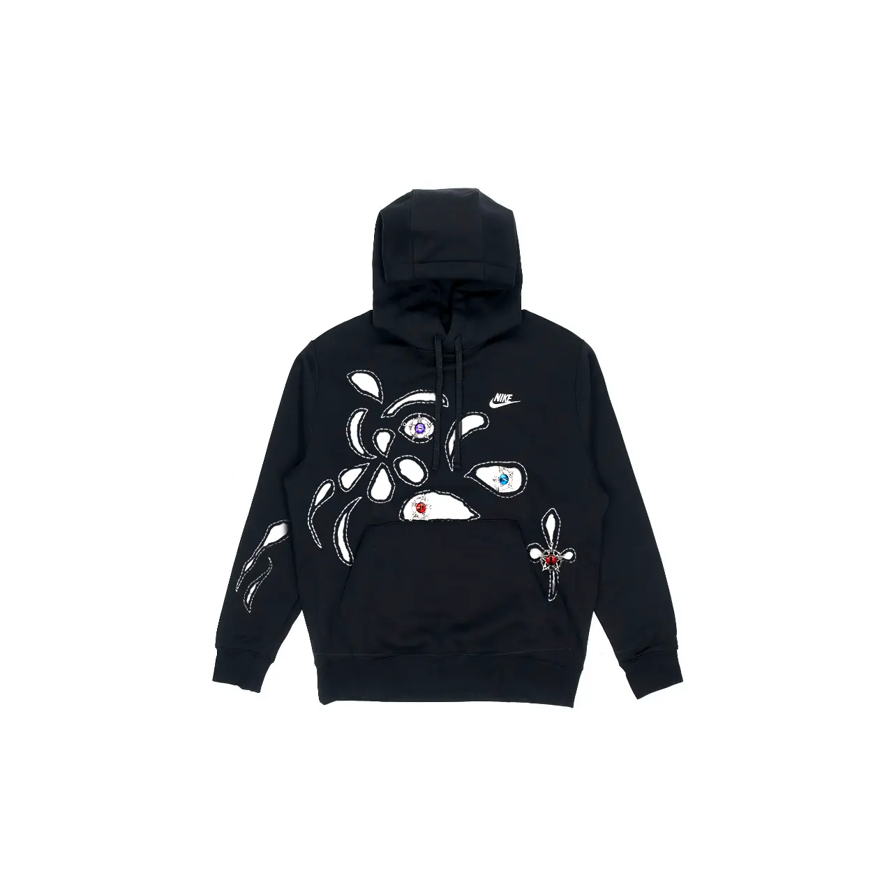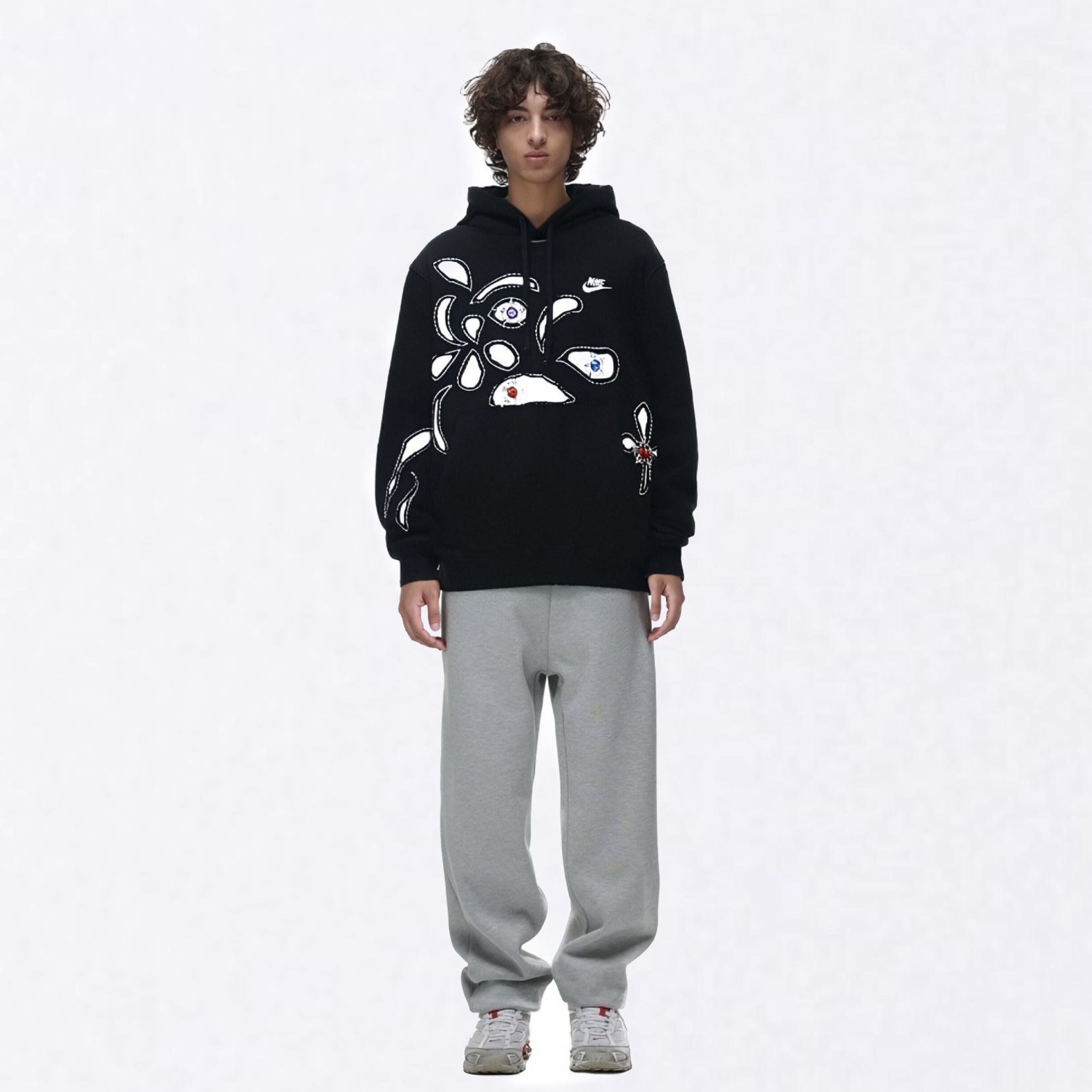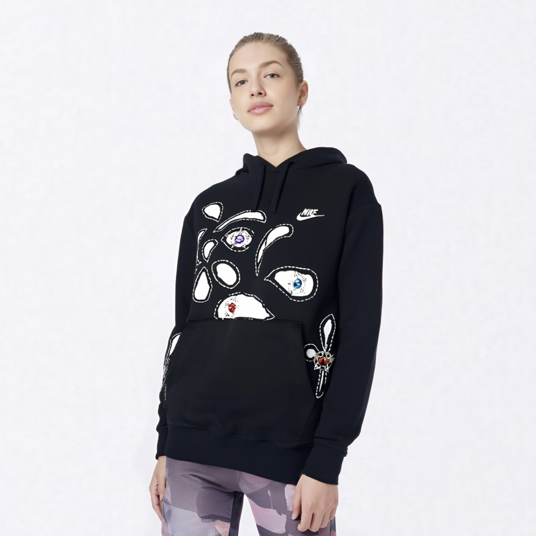 В основе этой модели, изготовленной на заказ, лежит черная флисовая толстовка Nike с капюшоном. Оригинальный асимметричный рисунок с декоративными элементами в виде глаз придает ей уличный стиль и значительно снижает вероятность повторения наряда с кем-то другим. Расположение рисунка может незначительно отличаться от модели к модели. В связи с особенностями процесса производства и материалов, изделие следует беречь от острых предметов, длительного намокания и сушки при высоких температурах.